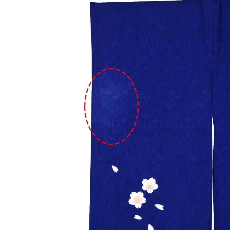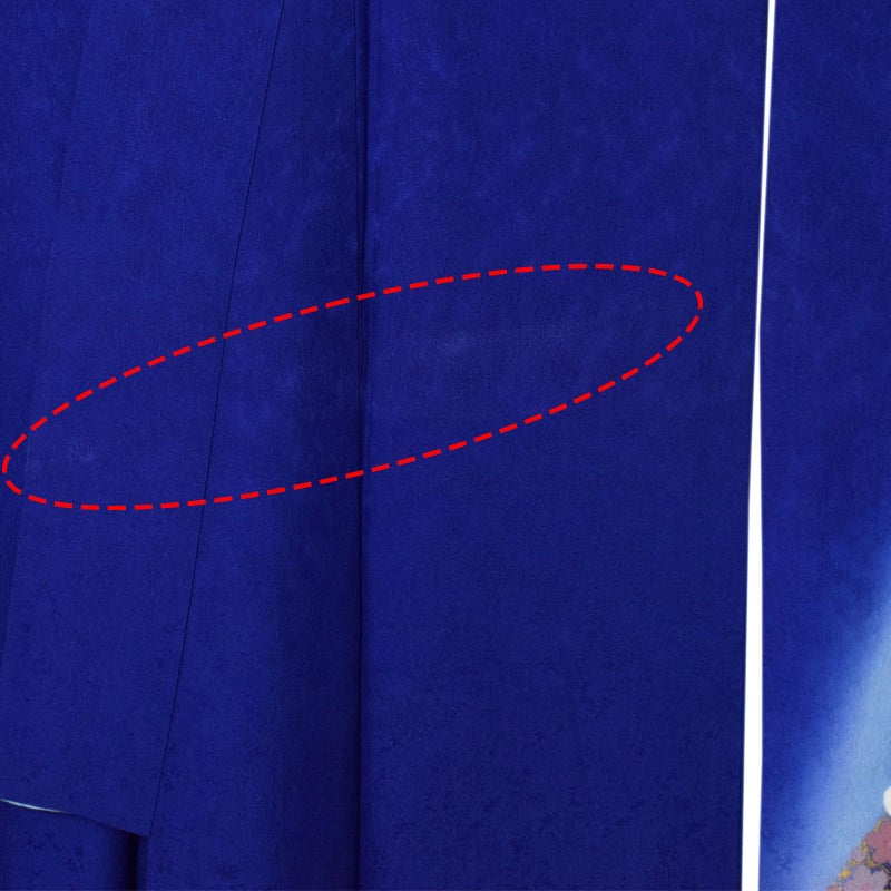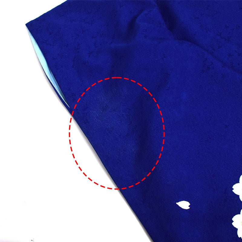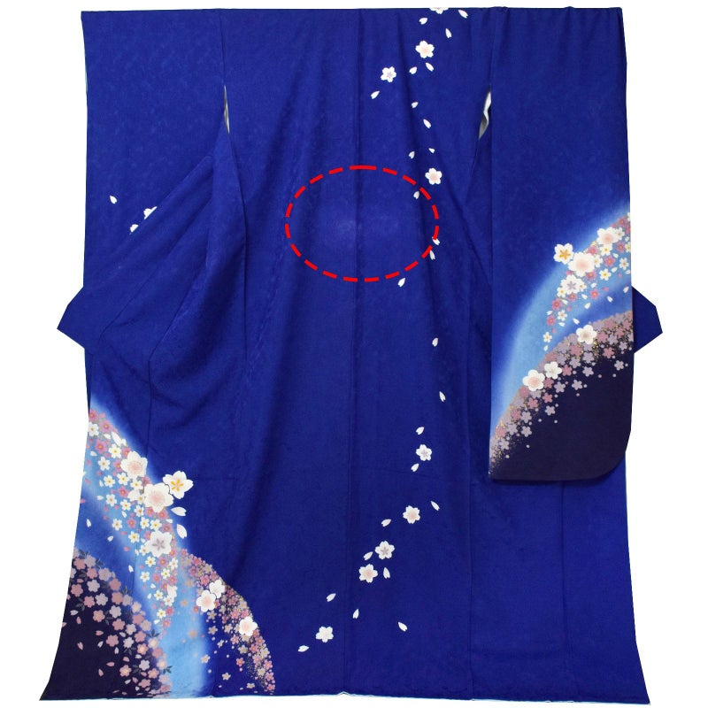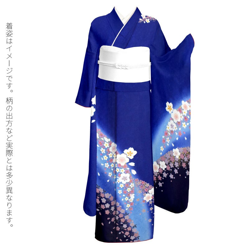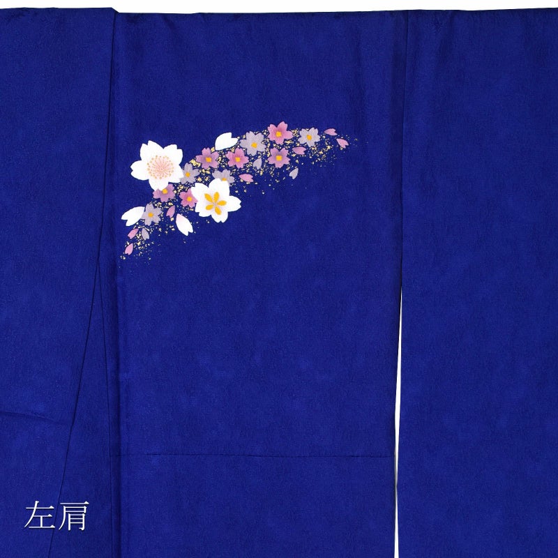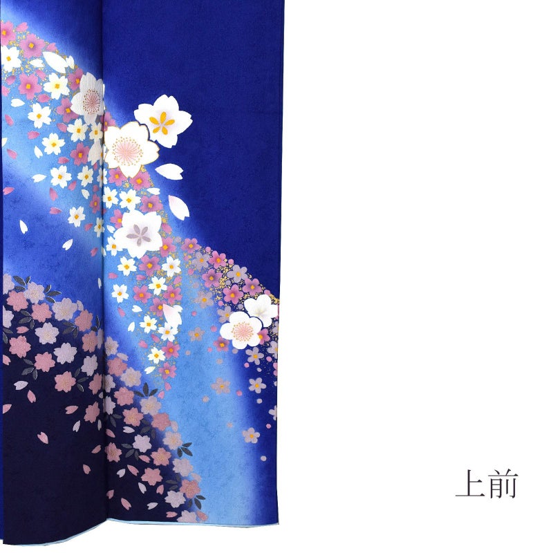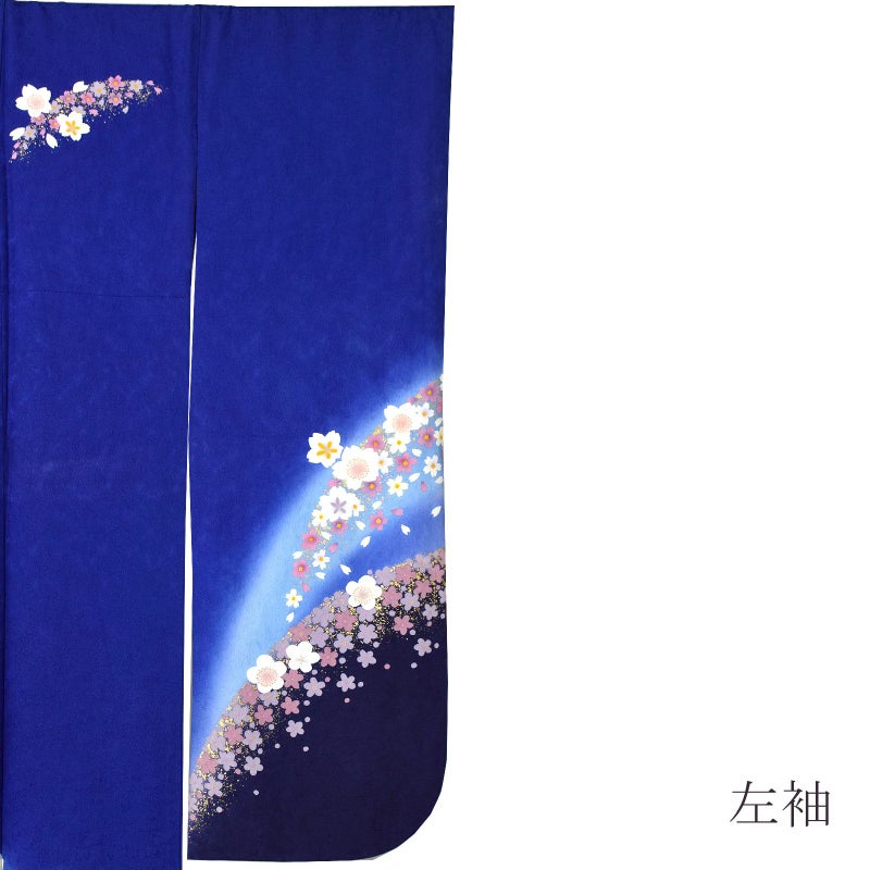 【色柄】あざやかな深い青地、裾に弧を描くように水色ぼかし、濃紺。弧に添ってくすみピンクやグレーの桜の小花、その上に白にピンクぼかしの梅や桜の花。ポイントに金彩。八掛は明るい水色。