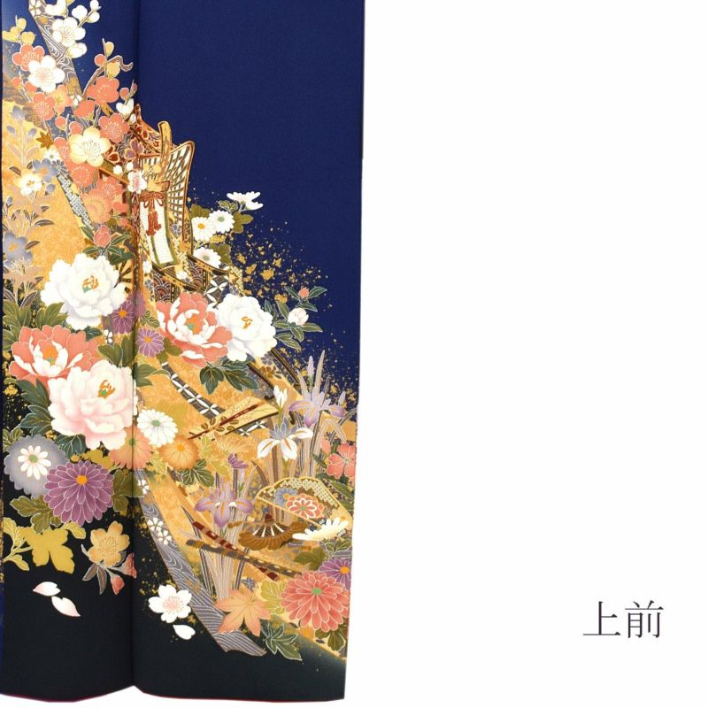 【色柄】深い紺色の地に香色、黒緑色の裾ぼかし。裾全体に金彩、その上に浅い朱色、白や黄土色の御所車。白や錆朱、浅紫に深緑色、抹茶色、臙脂などの牡丹に菊、桜、杜若などの四季花に蔓帯、扇子や楽器。八掛は深い赤。