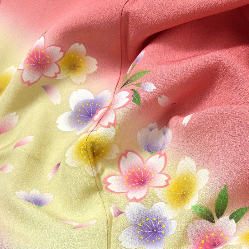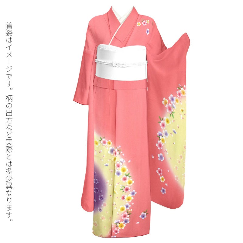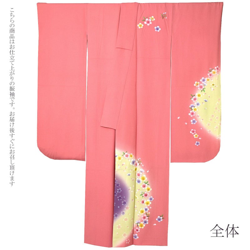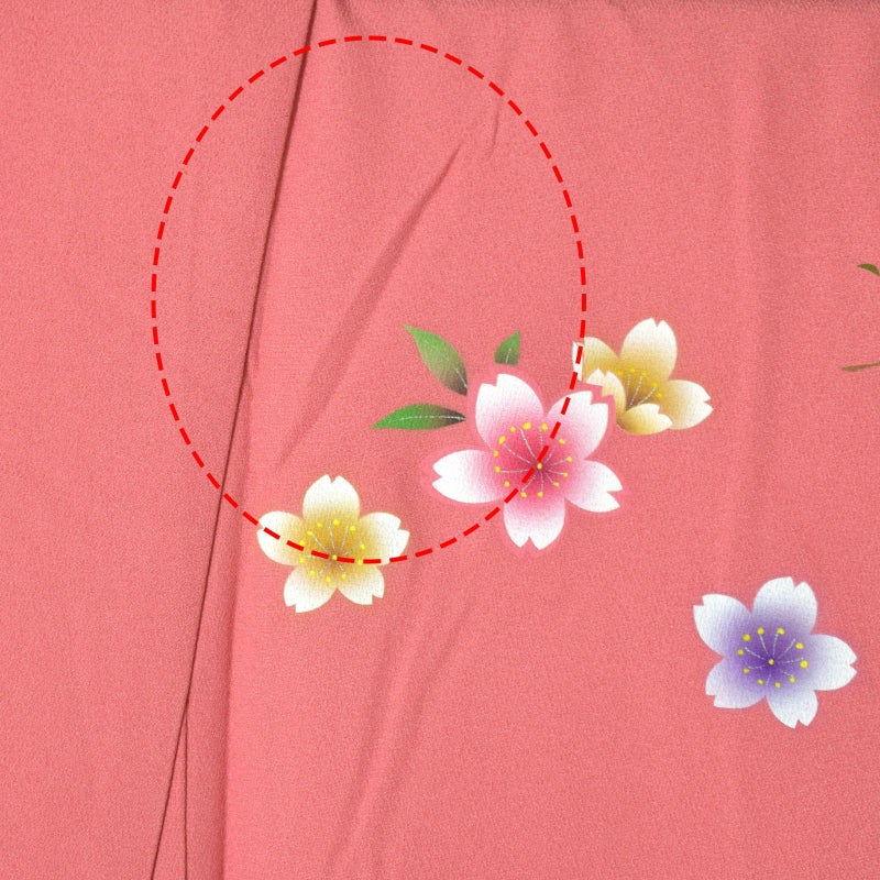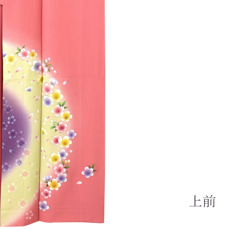 【色柄】赤みのピンク色の地に、上前、袖に円を描くように淡い黄色、紫のぼかし。白い花弁に淡いピンク、薄紫、水色、黄色などが挿された桜の花が円に添うように散らされ、まるで桜が水際に咲きこぼれているようです。緑の枝葉。八掛は表と同色。