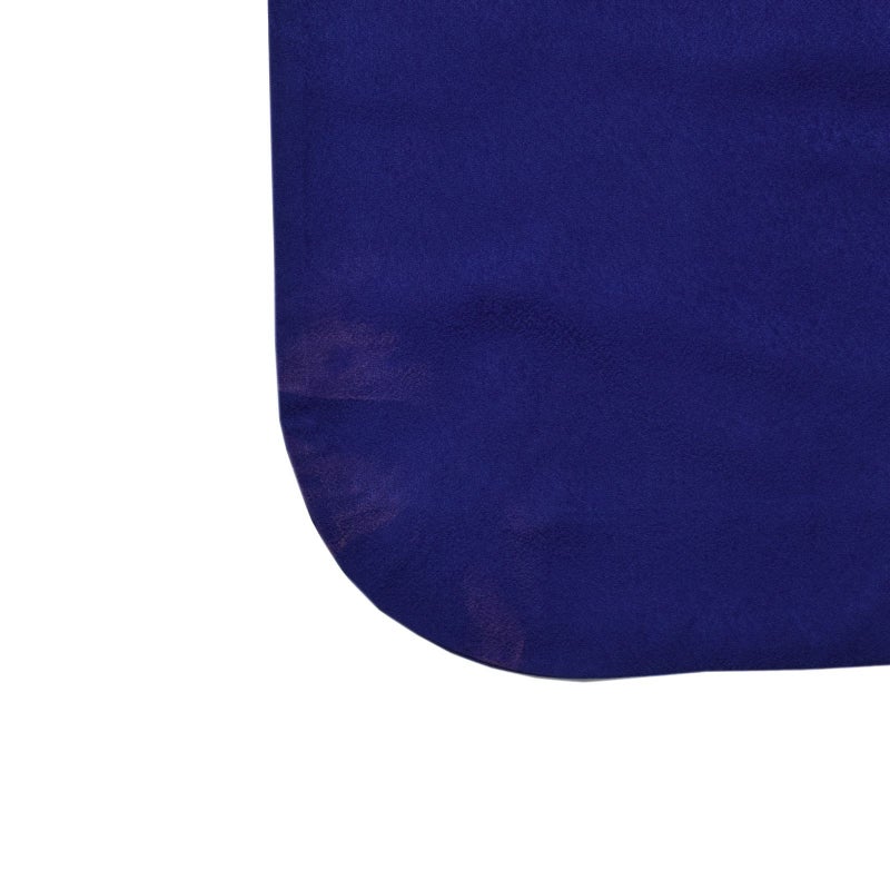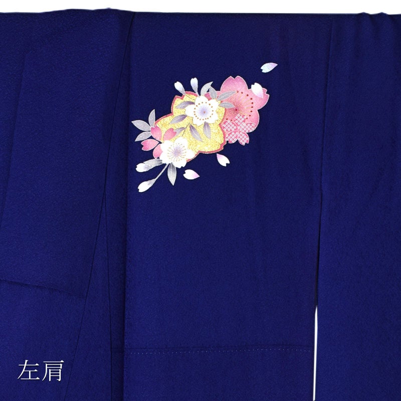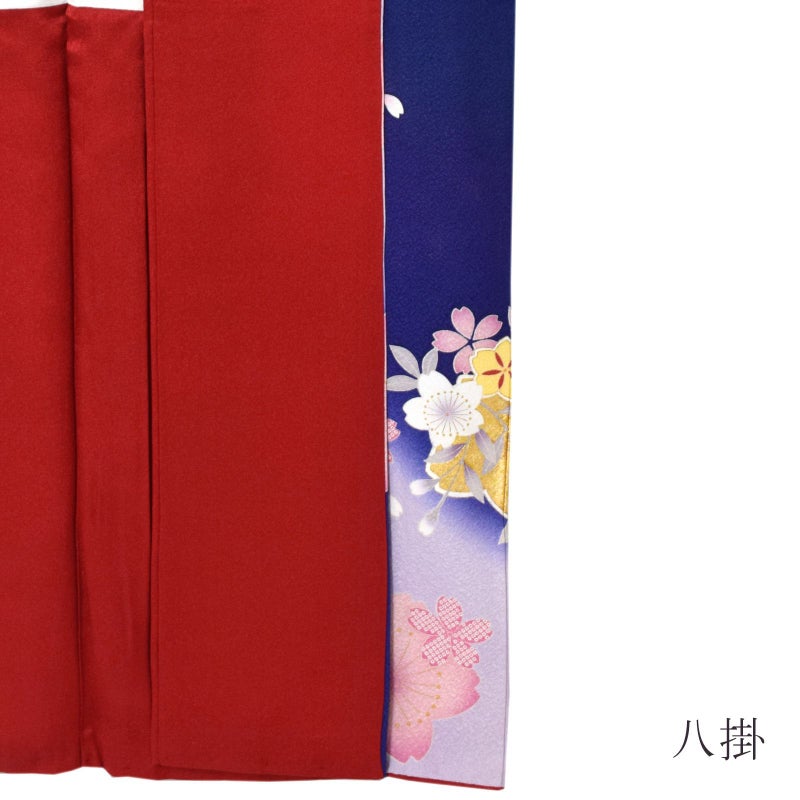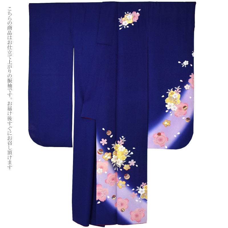 【色柄】あざやかな紫みの深い青の地、裾や袖に淡いパープルのぼかし。金彩やピンクの桜の花紋。白にピンクぼかし、黄色の花にグレーの葉の桜。黄色や赤、深紫の手鞠が散らされています。八掛は深い赤。