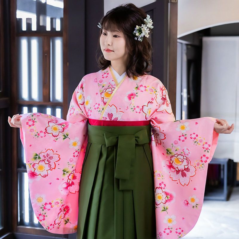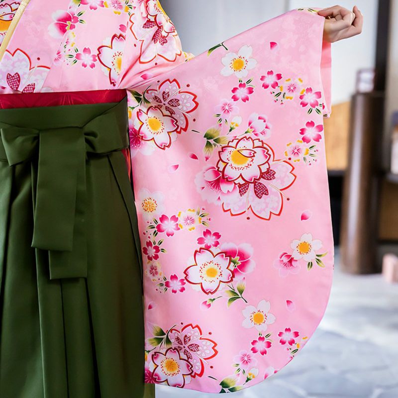 【色柄】清楚なピンク地に、いろいろな形の桜を重ねた、桜尽くしのお着物です。見ているだけで楽しくなるような、晴れの日にふさわしい明るく華やかなお着物です。