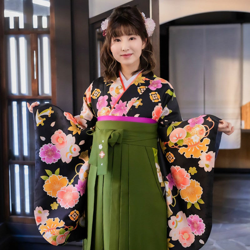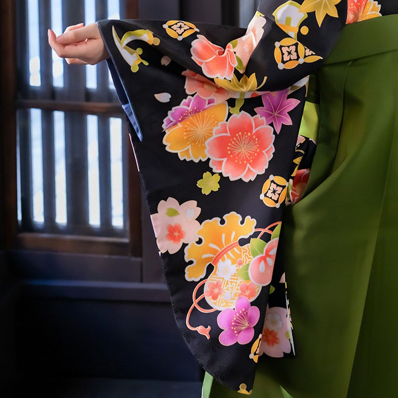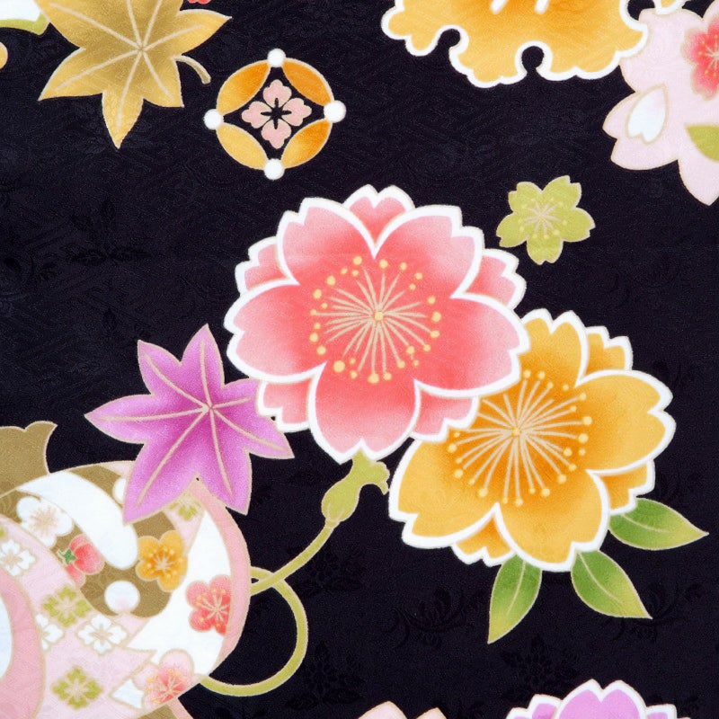 【色柄】黒地に、桜・楓・橘を表現し、宝尽くしの文様を加えたお着物です、宝尽くしの柄と花々の文様が溶け合い生み出された文様は可憐でいて上品さをたたえています。
