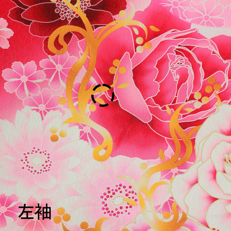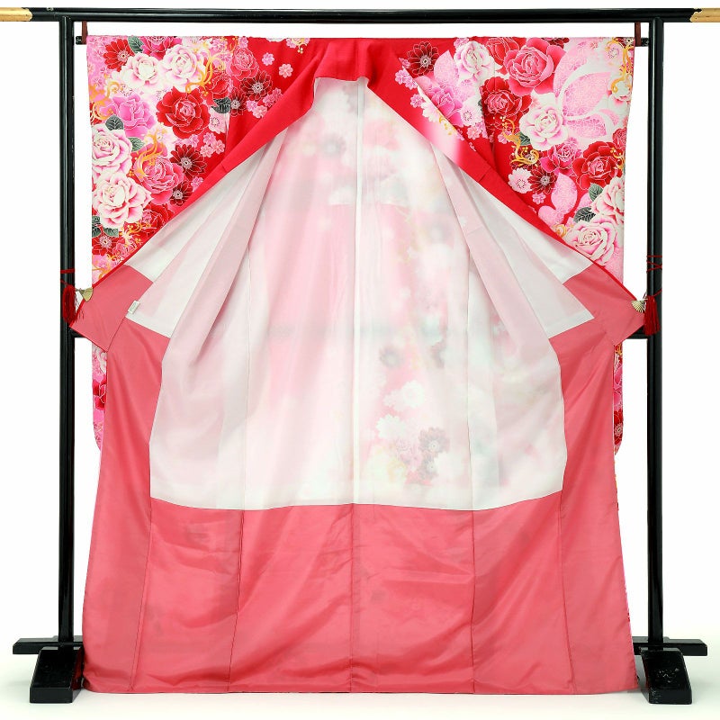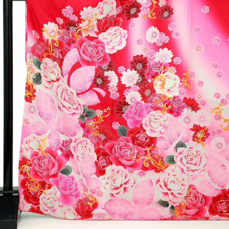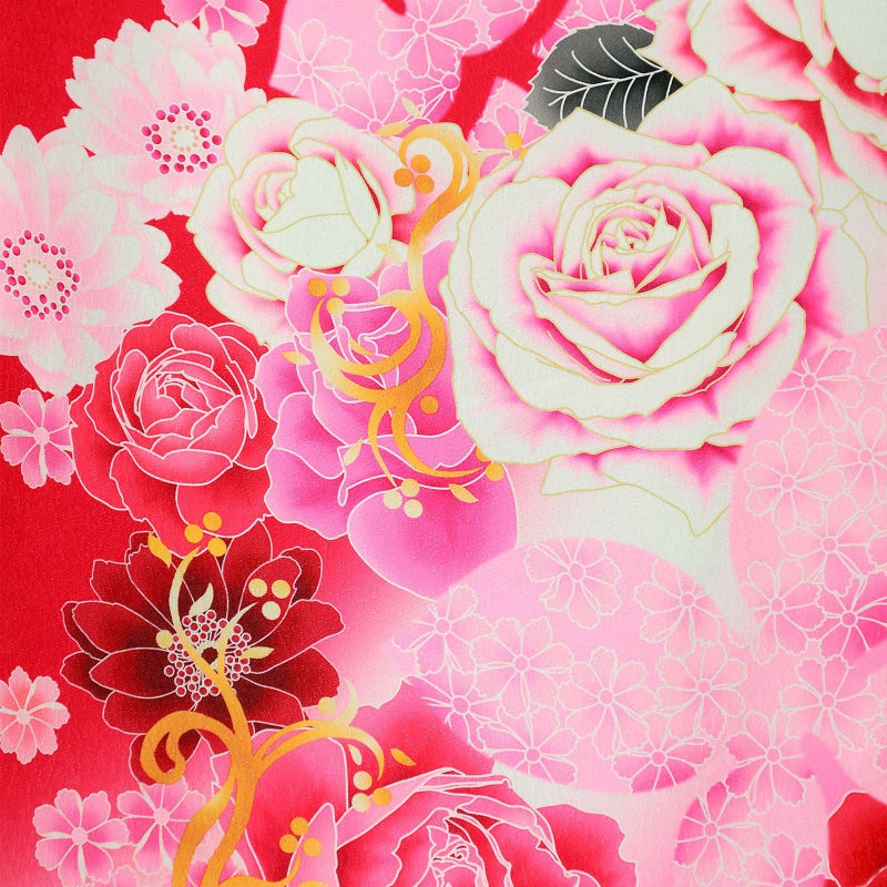 【色柄】バラに蝶 赤色地にピンクぼかし