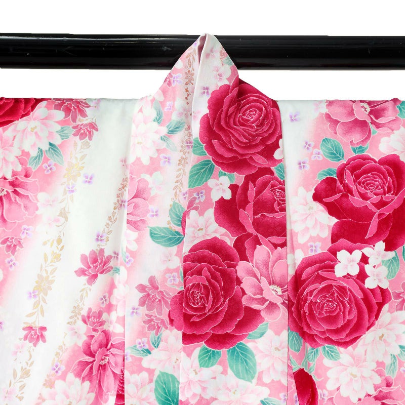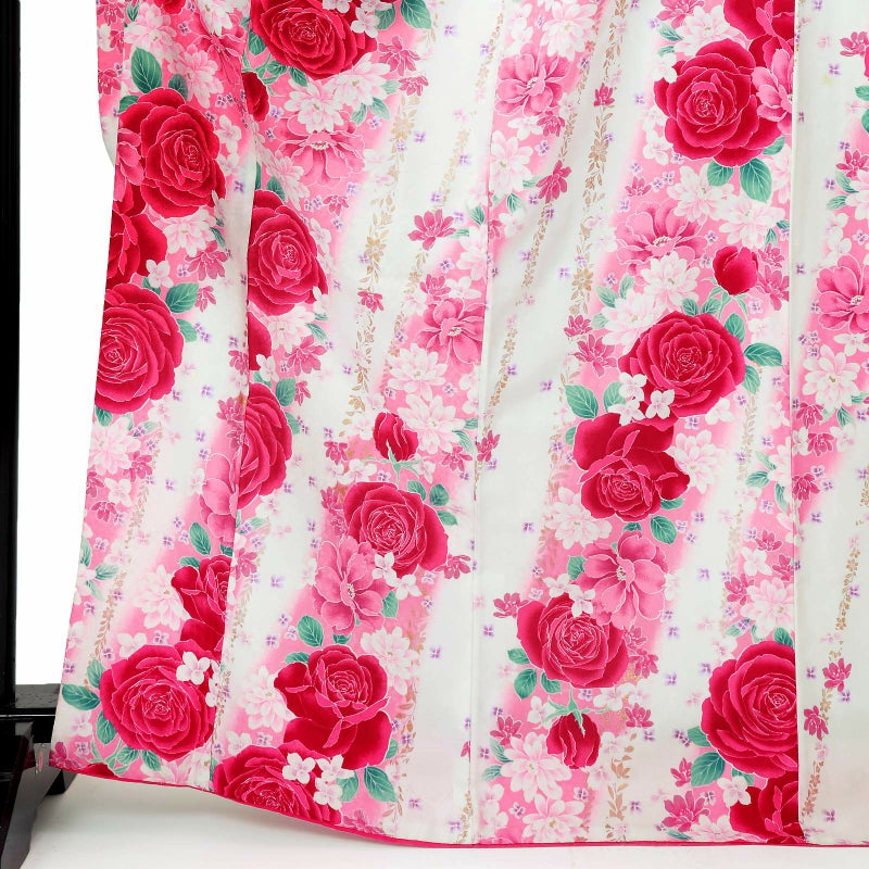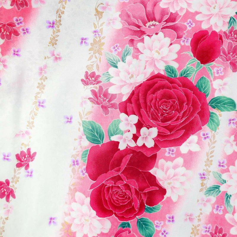 【色柄】斜め縞 薔薇と小花 象牙色地にピンク