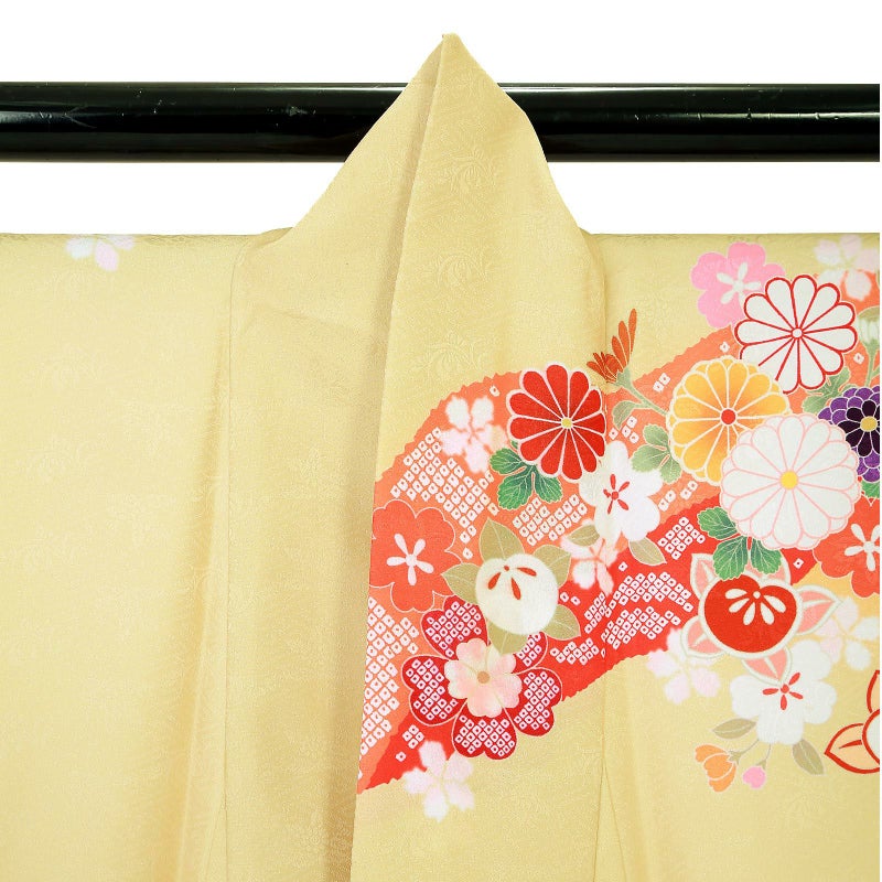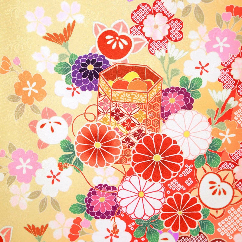 【色柄】貝桶に青海波 七宝 季節の花 淡黄