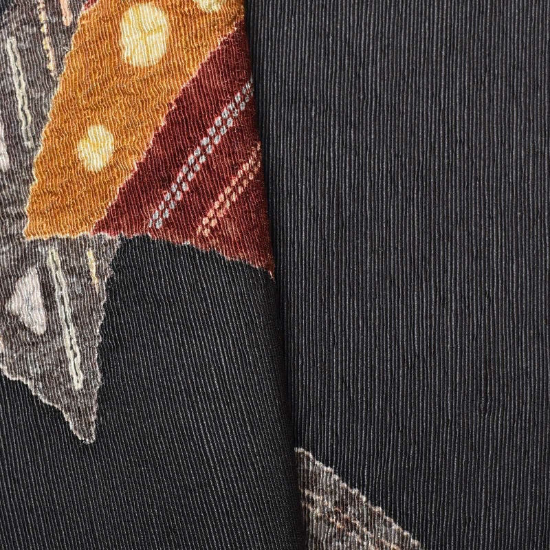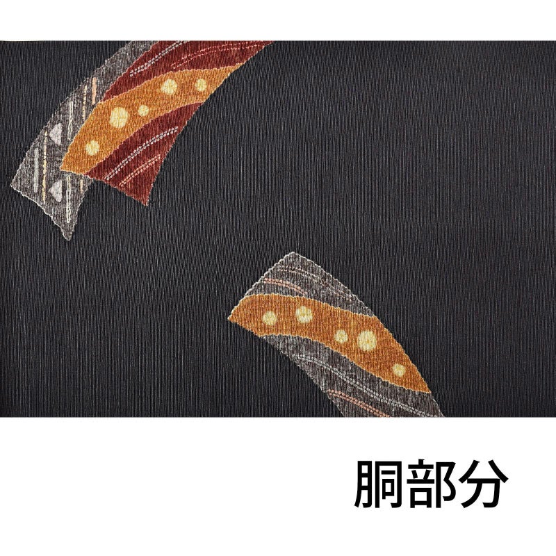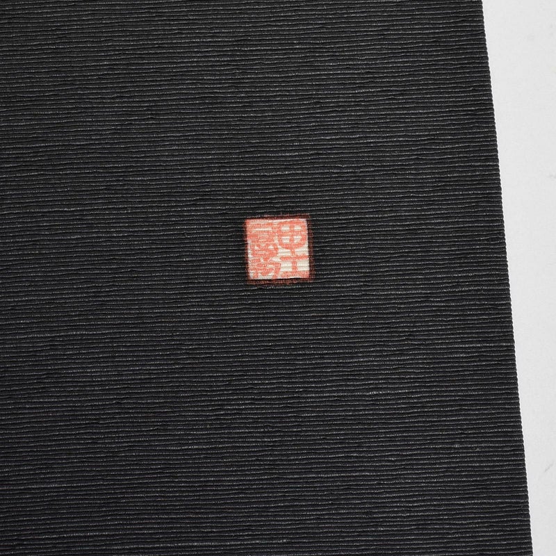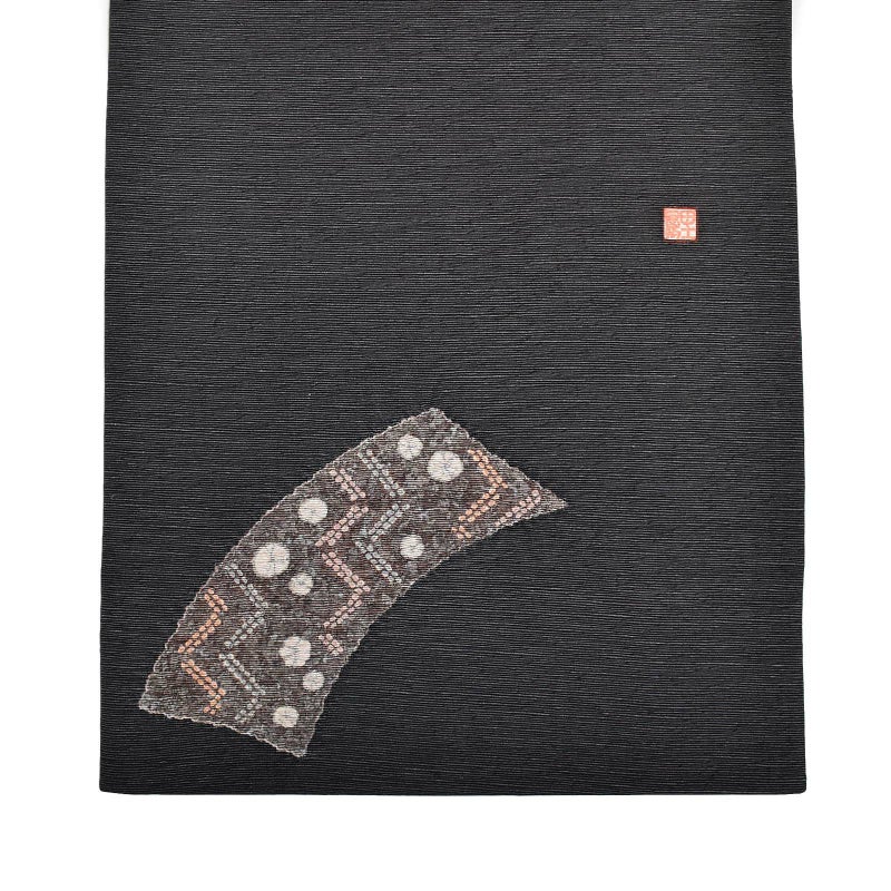 非常に柔らかい墨色の帯地に短冊模様が描かれた染の帯です。黒ではなく墨色が使われ、明度を抑えた色味なので落ち着いた雰囲気が印象的です。