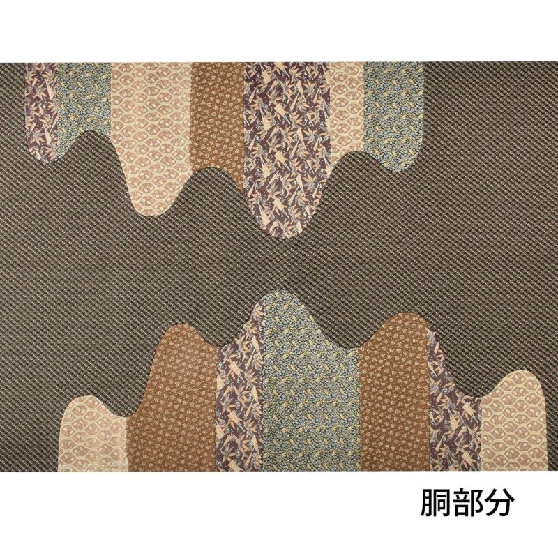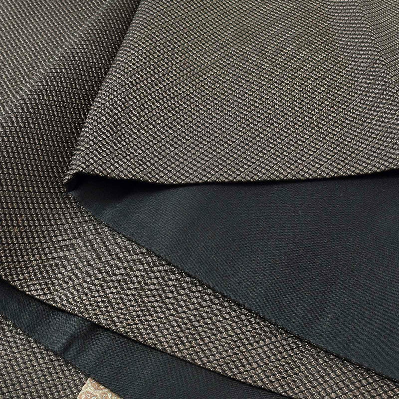 黒地の格子に小豆のような粒を配し、お太鼓部分、胴元には着物の異なる四種の小紋文様を施しています。