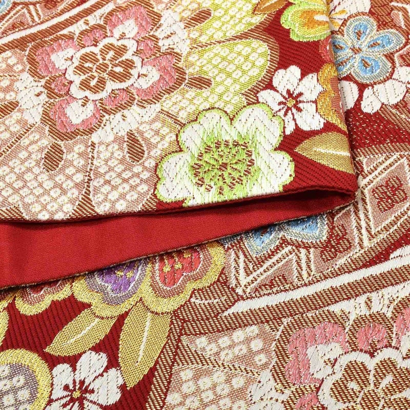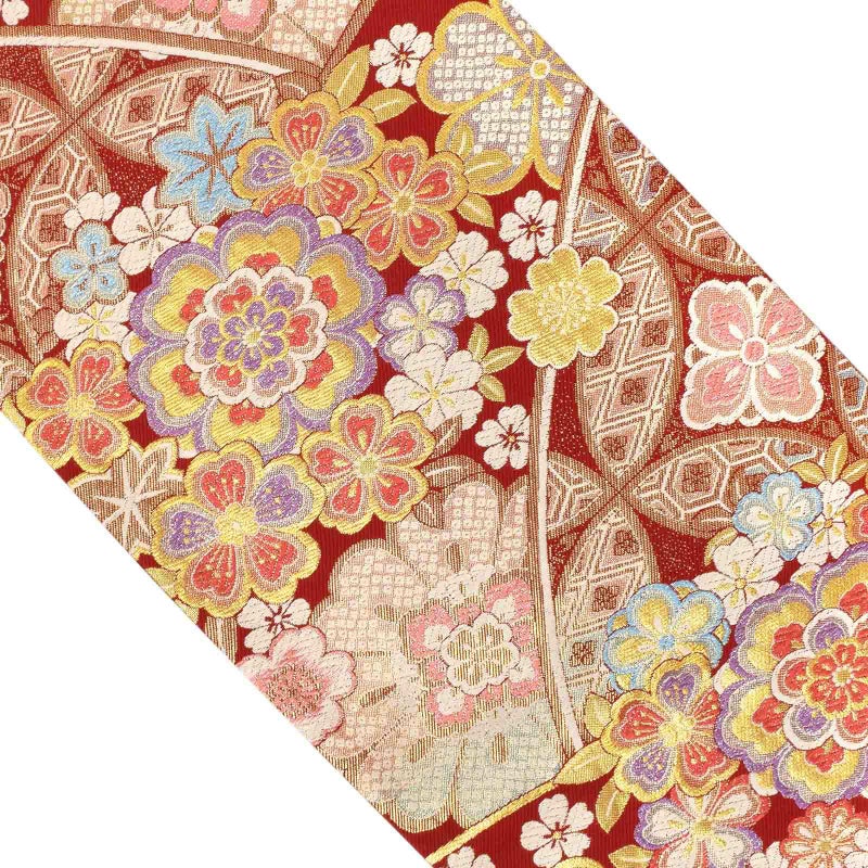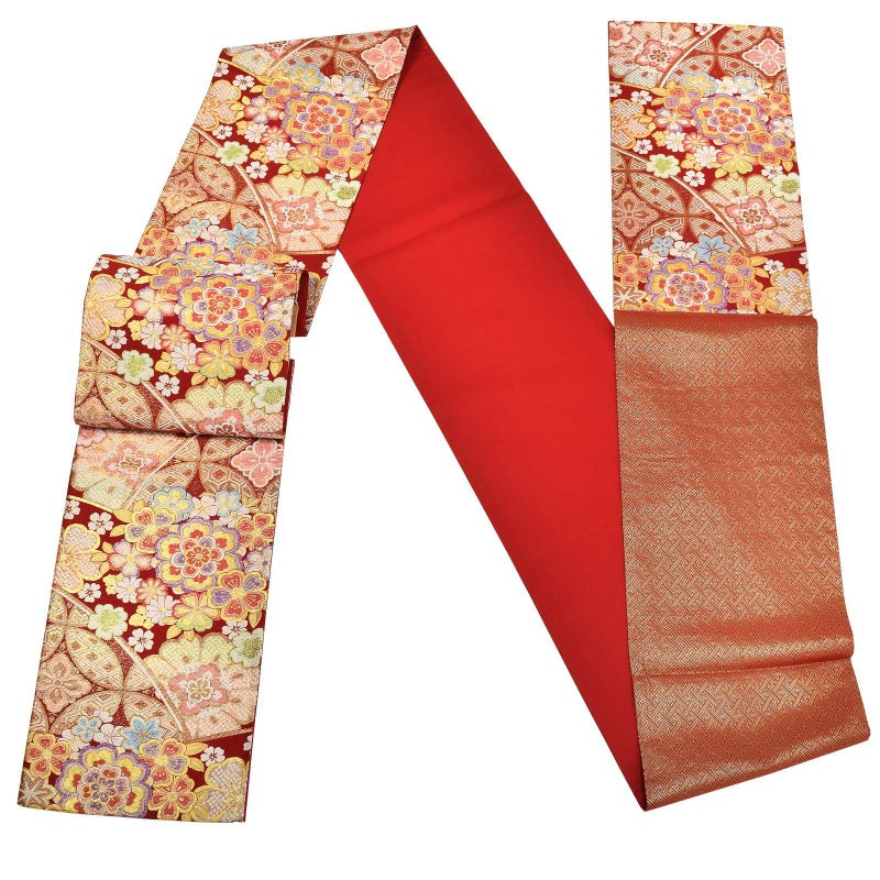 【色柄】深い赤の地色に、金糸七宝と大小の花紋が織り込まれた煌びやかな袋帯です。晴れの日を彩る振袖に。お手持ちの振袖に合わせて、また、ママ振や姉振に合わせて、自分だけの装いに。成人式、結婚式などのおめでたい席の振袖に。上品な華やかさを演出してくれます。