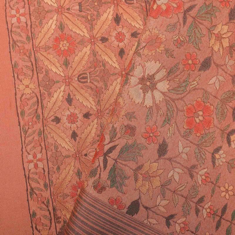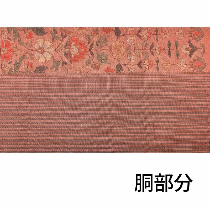 夜明けの空が東方から徐々に明るんでゆくような紅色に間道と更紗が配された素敵な名古屋帯です。