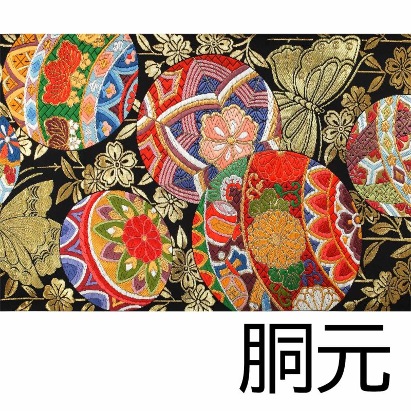 華やかな振袖に負けない豪華な唐織の袋帯です。黒地に金糸をふんだんに使用した織のコントラストが美しく、カラフルなので様々な色の振袖にもコーディネートしやすいデザインです。