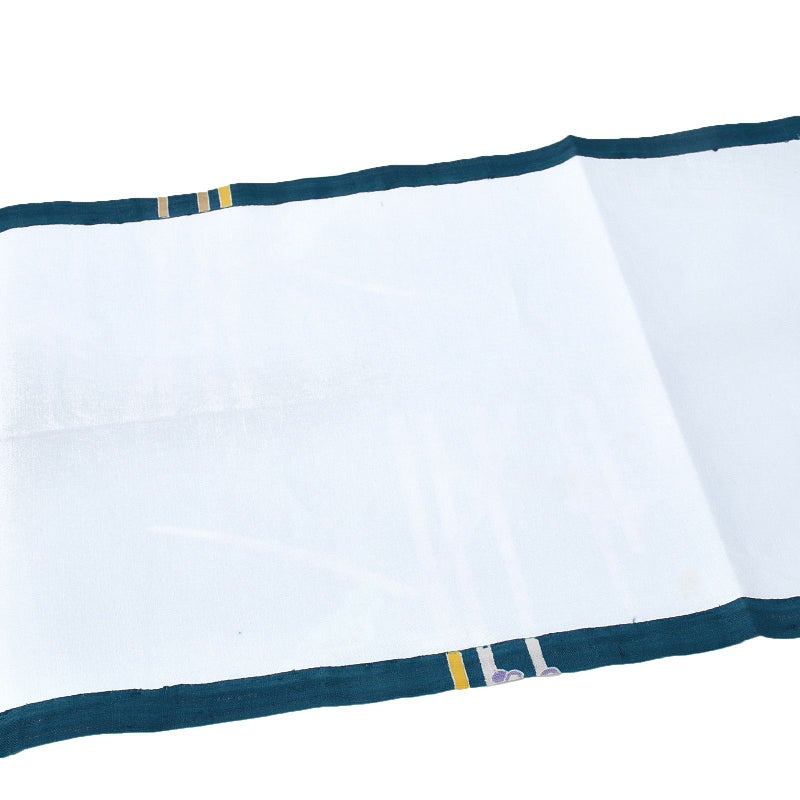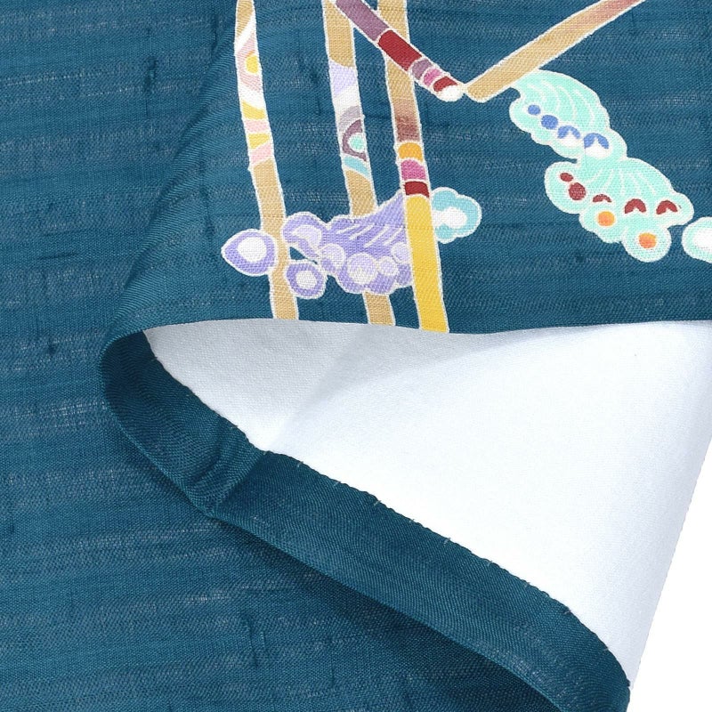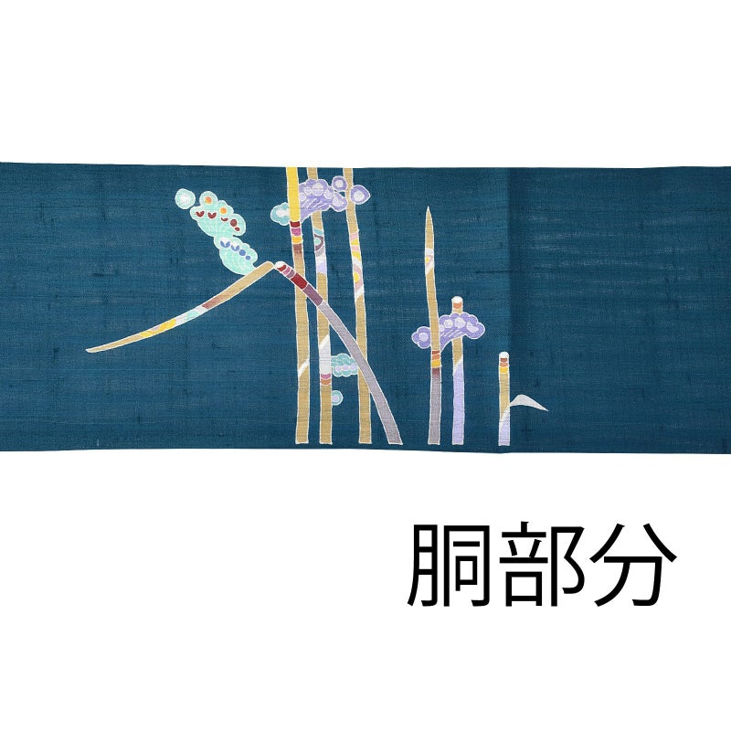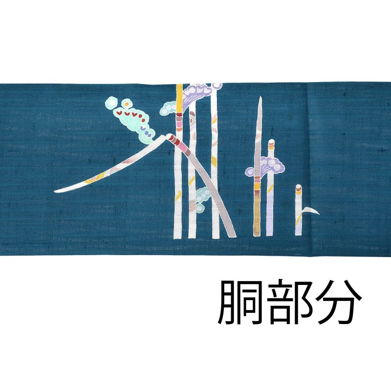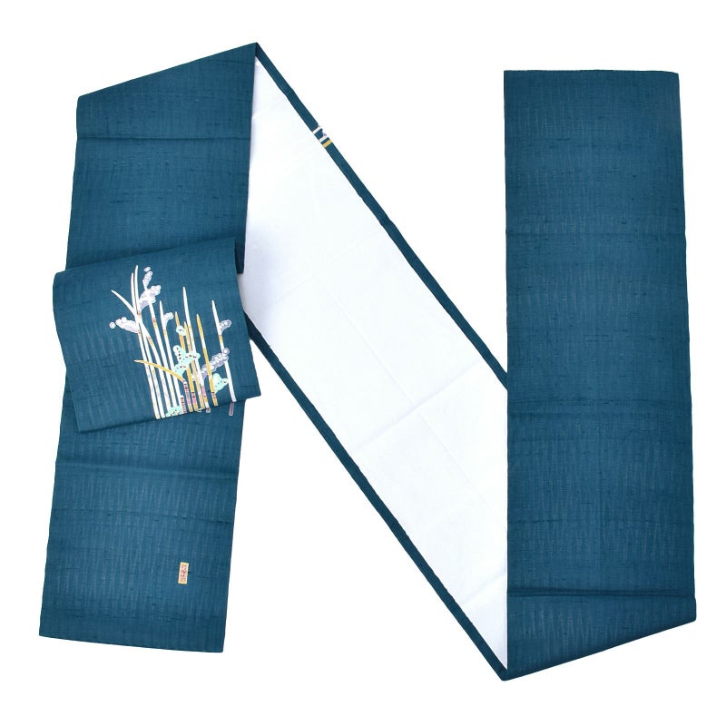 石川県指定無形文化財・加賀友禅技術保存会会員でもある作家「中町博志」の九寸帯です。加賀友禅は日本三大友禅のひとつ、石川県金沢市発祥とされる伝統的な染色技法です。五彩と言われる臙脂・藍・黄土・草・古代紫を基調とし、写実的な草花模様や、外暈しや虫食いの技法を特徴としていますが、本商品は伝統的な技法で現代的な模様を表現しています。透け感のある孔雀青の地に、まっすぐに伸びる木賊の文様。白や浅い辛子色、白茶に、カラフルな節、抽象的に表現された羽根のような花が個性的です。付下や色無地、小紋、御召などのお着物とのコーディネートがおすすめです。