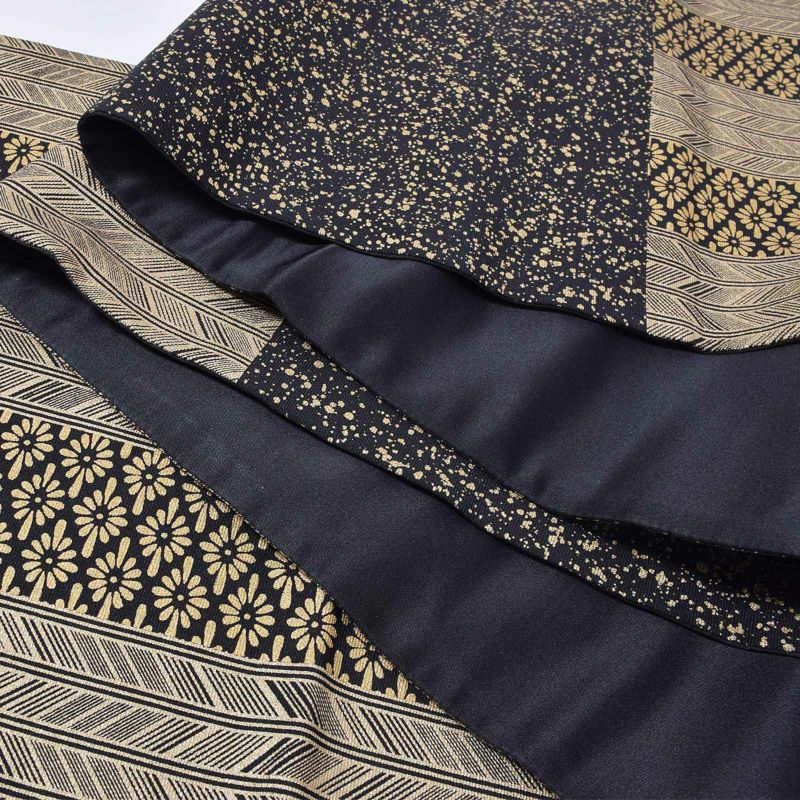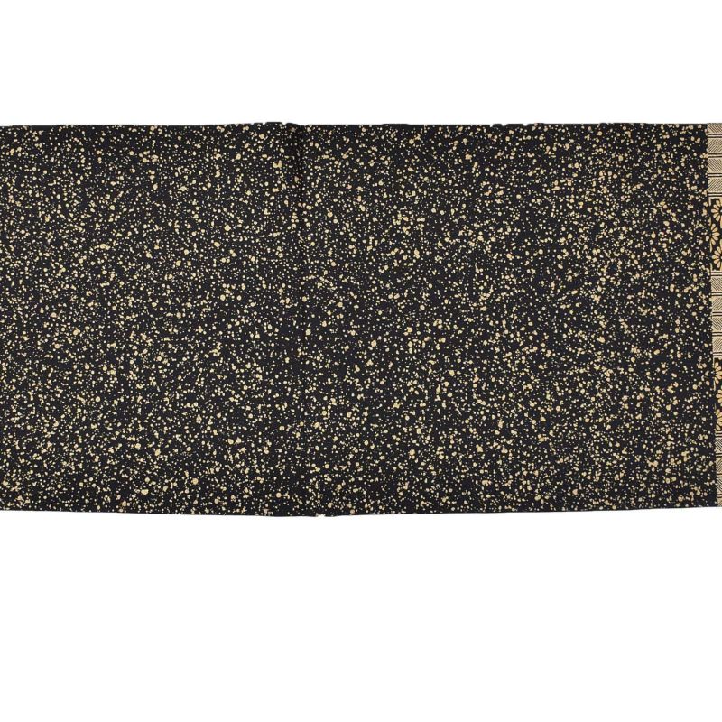 金箔を贅沢に使用した染めの袋帯です。黒地がきりりと雰囲気を引き締め、柄は人気の菊の花柄と矢羽根なので、お手持ちの着物にとても合わせやすいでしょう。見る角度によって箔が反射して見え、清廉な粋を感じさせます。