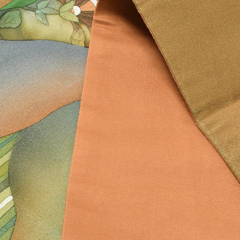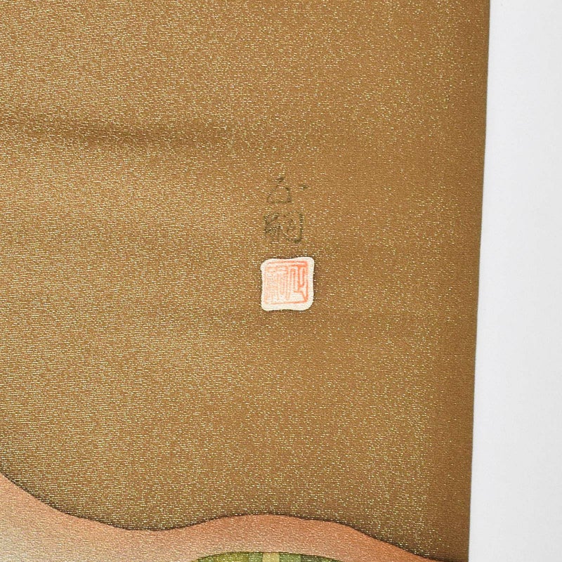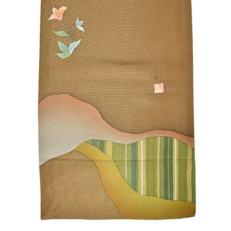 渋く深みのある桑茶色に金糸を織ることで奥行きと高級感のある帯地です。伝統的な友禅あるものの、花のデザインはシックでモダンに描かれており、まさに「作家物」に相応しい逸品です。