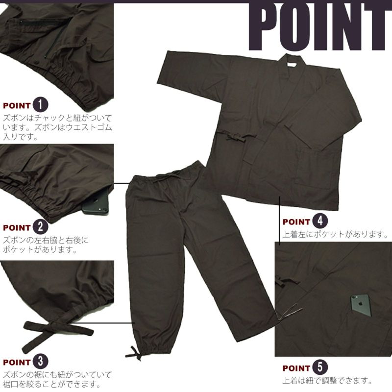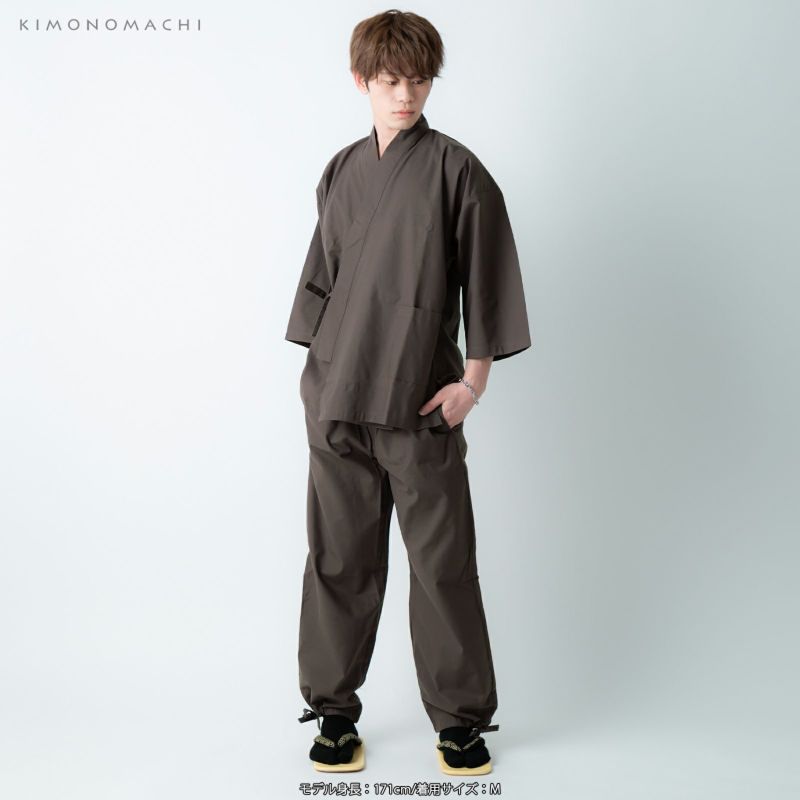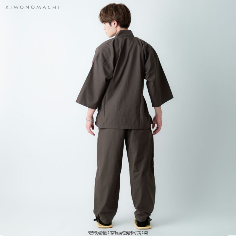 綿ポリ素材の、通年で着ていただける作務衣です。上着、ズボンの上下に分かれています。