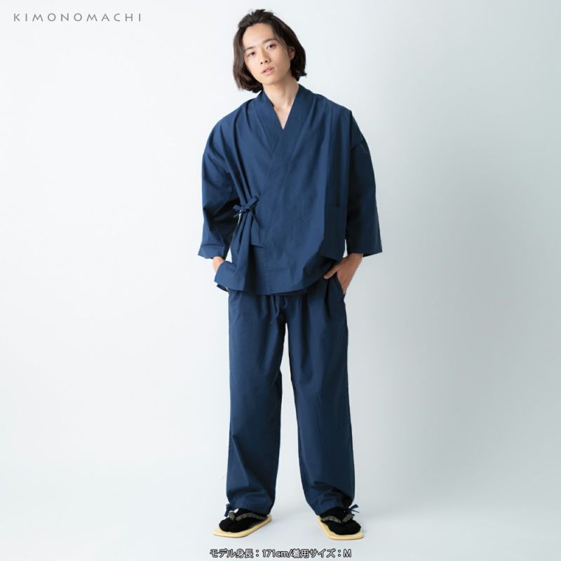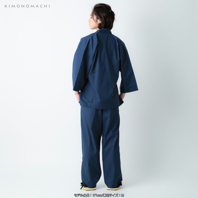 綿ポリ素材の、通年で着ていただける作務衣です。上着、ズボンの上下に分かれています。
