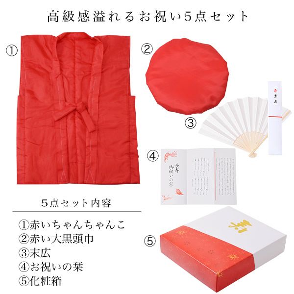 【商品内容】頭巾、ちゃんちゃんこ、末広(扇子)、栞、化粧箱の計5点