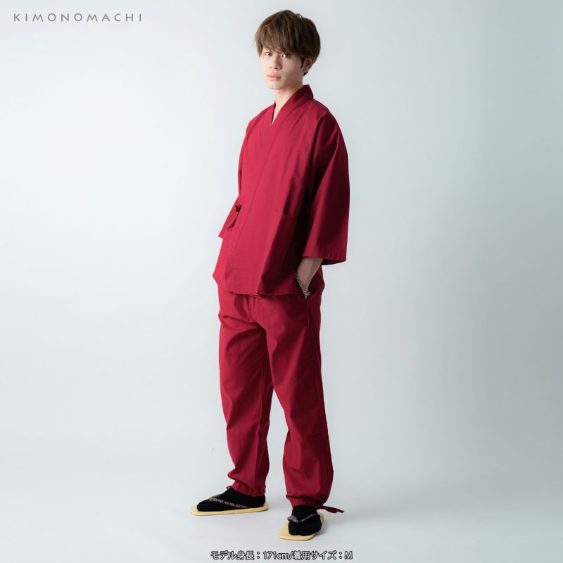 綿ポリ素材の、通年で着ていただける作務衣です。上着、ズボンの上下に分かれています。