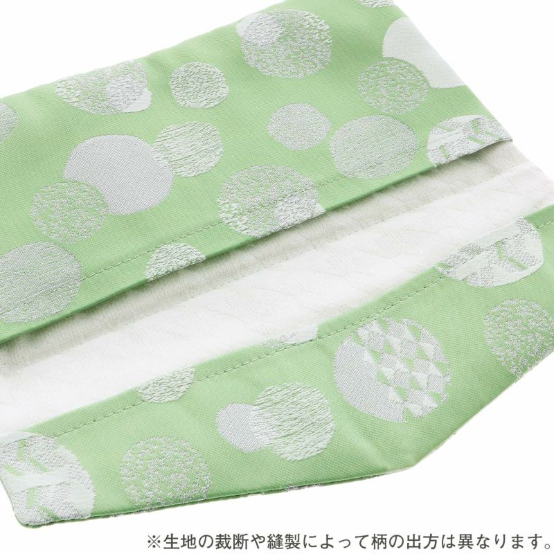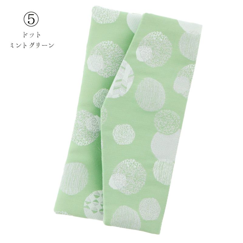5.ドット ミントグリーン…グレイッシュな薄緑の地。白とシルバーのランダムなドット模様。いろいろな織の表現で変化をつけています。裏地は白の千鳥格子。