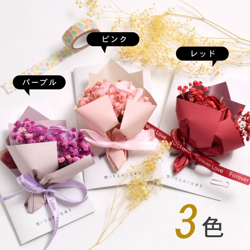 ローズはソープフラワー、カスミソウはプリザーブドフラワーです。
