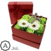 A. Red…深い赤のボックスに、明るい黄緑色のバラやカーネーション、アジサイ、白いガーベラの形のフレグランス。ブラウン系のリボンを添えて。