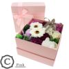 C. Pink…淡いピンク色のボックスに、深紫やパープル、白のバラやカーネーション、アジサイ、白いガーベラの形のバスフレグランス。ブラウン系のリボンが添えられています。