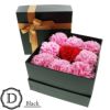 D. Black…明るい茶のリボンを掛けた黒のボックスに、ピンク色のカーネーションのフレグランス。真ん中だけ赤のハート型にかたどられています。