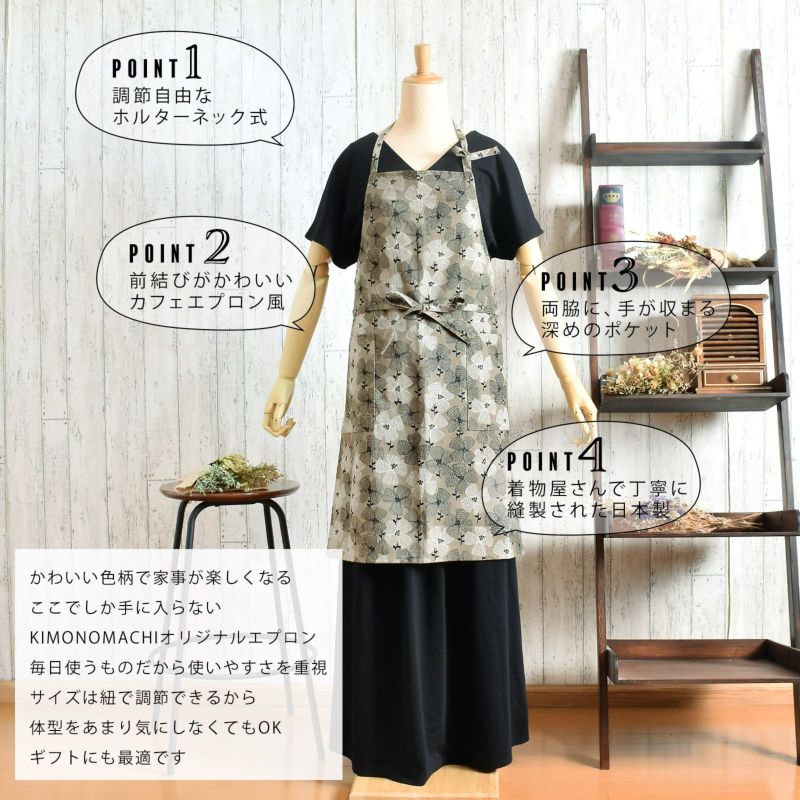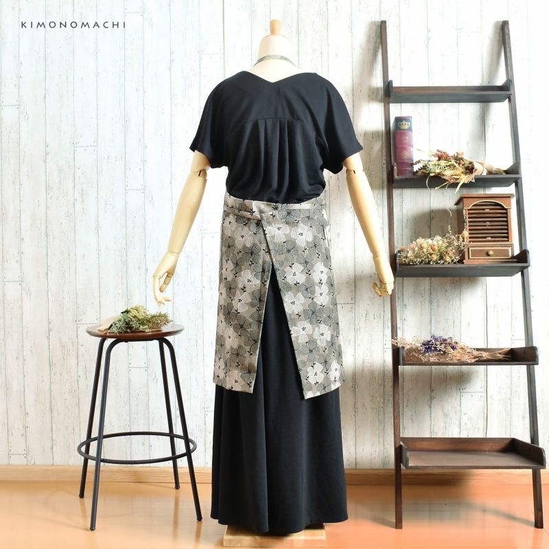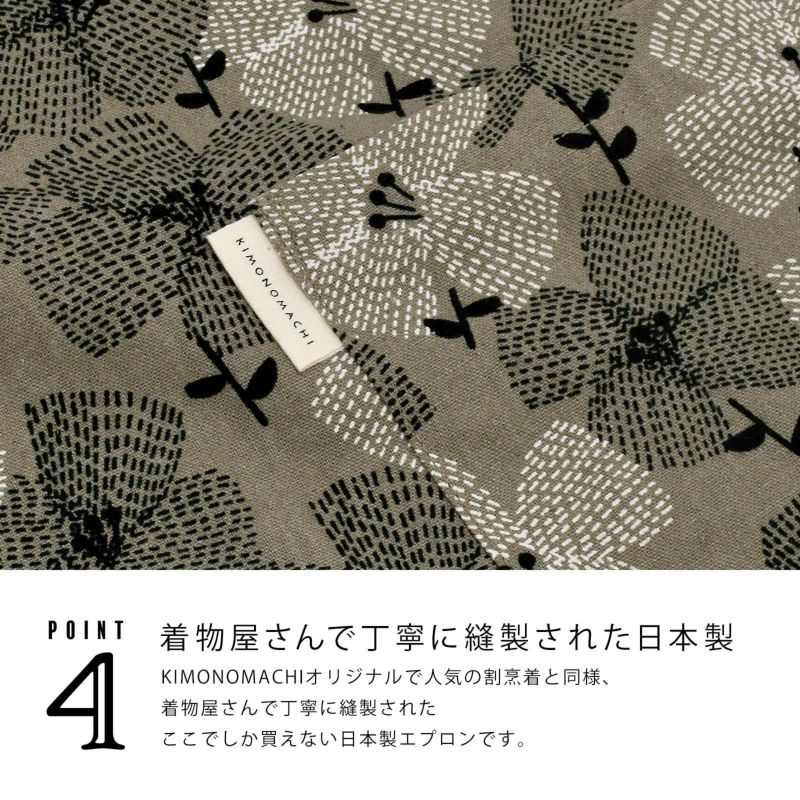 4. エプロン「グレー テンセンフラワー」 実用的 日本製 オシャレ かわいい KIMONOMACHI オリジナル カフェエプロン 母の日 敬老の日 誕生日 プレゼント、ギフト、贈り物に最適<H> 【送料無料】【メール便対応可】ss2506wkm10