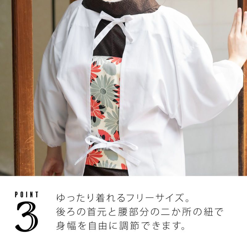 後は首元と腰部分の2箇所に結び紐がついていますので、帯のふくらみや体型にあわせて自由に調節していただけます。