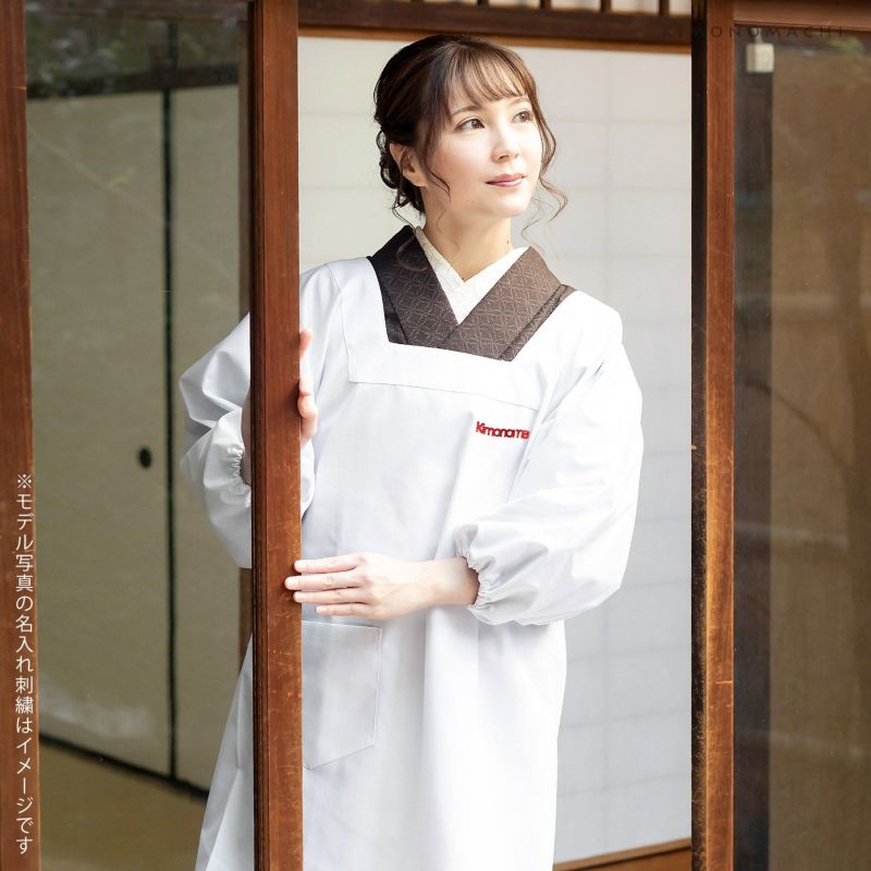 京都きもの町オリジナルのシンプルなデザインがかわいい白割烹着です。