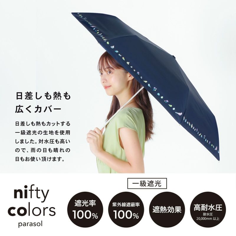 (母の日割クーポンで200円OFF)日傘 晴雨兼用「nifty colors 遮光ことりたちミニ55 オフホワイト・ネイビー 2468」遮光 遮熱 撥水 はっ水 防水 UVカット PU加工 折りたたみ 折傘 女性用 レディース women's プレゼント ギフト 母の日【メール便不可】
