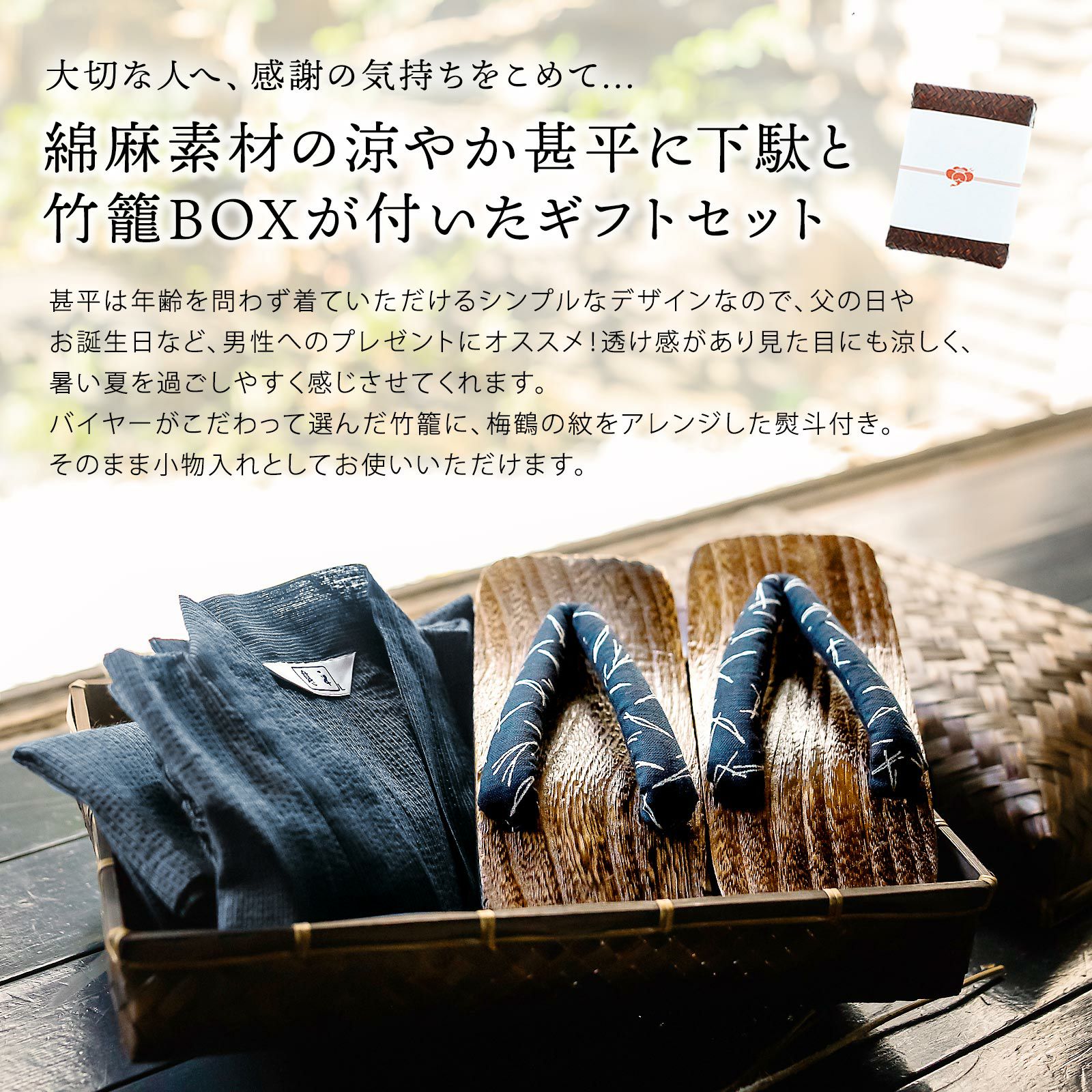 他の画像を見る 送料無料 父の日のプレゼント 敬老ギフト 贈り物に おしゃれな甚平 和の部屋着【ラッピング無料】 甚平 メンズ おしゃれ 「しじら織り 綿麻甚平と下駄の竹籠入りギフトセット 全11柄 6サイズ S M L LL/2L 3L 4L」 父の日 敬老の日 男性 プレゼント 涼やか 綿麻甚平 上下セット ルームウェア 部屋着 セットアップ 花火大会 夏祭り じんべい じんべえ 【送料無料】【メール便不可】 きもの町価格 ¥ 8,360 税込 詳細を見る お気に入りに登録する