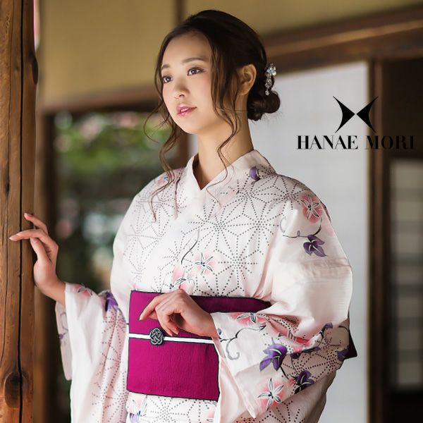 HANAE MORI(ハナエモリ)のブランド浴衣、京都きもの町オリジナルの浴衣帯、下駄(F、L~LLの2サイズからサイズをお選びいただけます。)の3点セットです。