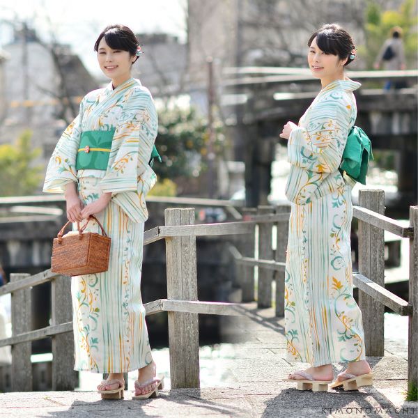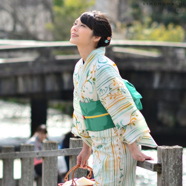 【カラー】浴衣は、生成り色地に、グリーン、オレンジ系の色使いの縞、唐草模様。ところどころに猫のシルエット模様。帯は、鮮やかな緑色。ハート型を三枚合わせたようなカタバミモチーフの模様。下駄は、鼻緒は白色地に濃い紺色、緑、からし色の矢羽模様。台は黒色の塗り。