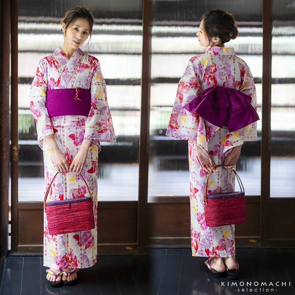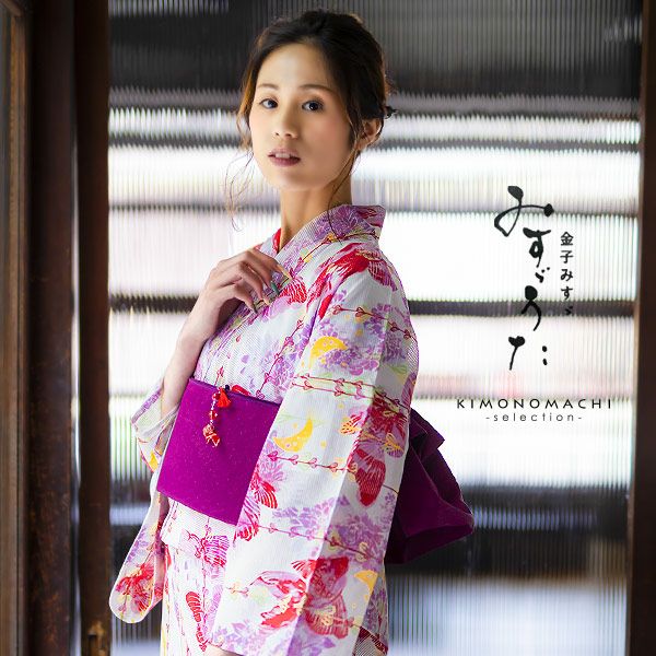 【カラー】浴衣は、白色地に、赤×パープルの色使いの艶やかな金魚模様。水草が縞模様のように配していて、縦のラインですっきりと見えます。帯は、濃い紫の無地。下駄は、鼻緒は白色地に紫、エンジ、くすんだ黄緑色の矢羽模様。台は黒色の塗り。