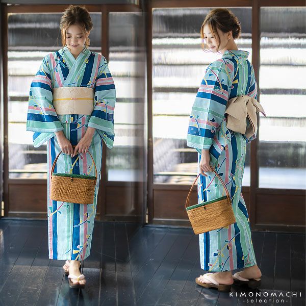 【カラー】浴衣は、水色、濃い青、ピンク、グリーンなどの色使いの縞に、幾何学のような枝葉模様。帯は、柔らかな白っぽいベージュの色合いに蝶々の模様。下駄は、鼻緒は白×薄ピンクのストライプ模様。台は焼桐の焦げ茶色。