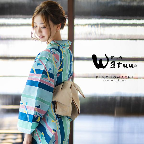 Watuu(和つう)のブランド浴衣、浴衣帯、下駄(F、L~LLの2サイズからサイズをお選びいただけます。)の3点セットです。