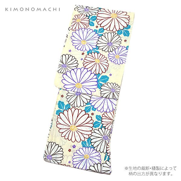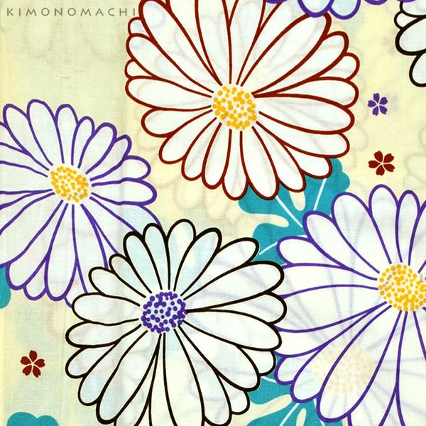 【カラー】ごくごく淡いクリーム色地に、黒、エンジ、青みの紫などの色使いの菊。緑みを含んだ青色の葉。