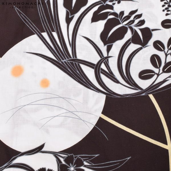 【カラー】黒っぽい濃い焦げ茶色地に、菖蒲、萩、撫子の花の丸。芝に、蛍のような柔らかな黄色のぼかしの丸。