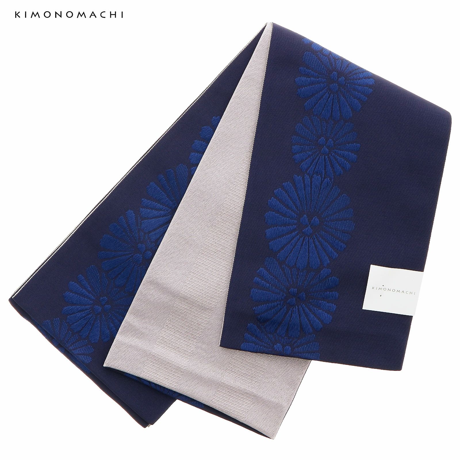 帯:深いネイビーに、濃いブルーの花模様が並んだ帯。菊花のような唐松文様のような、シンプルながらどこか古典的な雰囲気のあるデザイン。裏はシルバーグレーの地に織の二筋の縞。