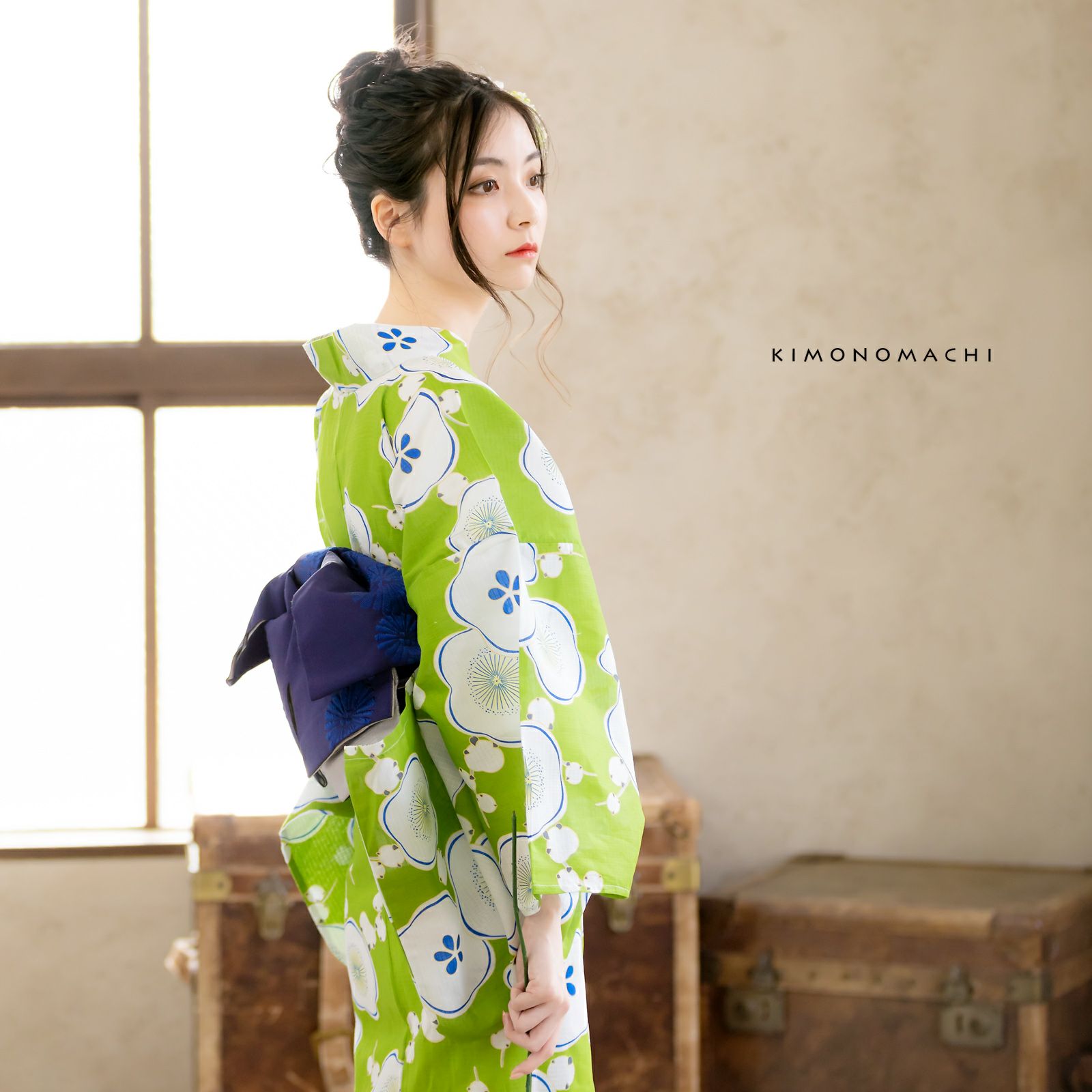 浴衣:濃い黄緑地に柔らかな丸みと曲線のある白い梅の花。花の部分には鮮やかな濃い青色のラインや、ところどころ色づいた黄色が使われています。花の間から少しだけ覗く枝の部分は薄いグレー。