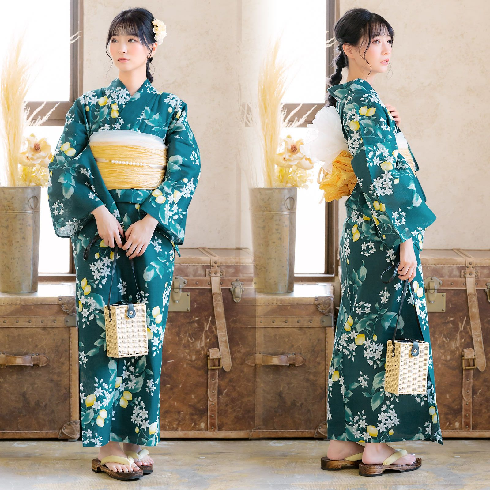浴衣:暗めの青緑色の地に、花や実をつけたレモンの柄。浅い青緑と白緑色のぼかしの葉。白と淡いグレーの花。明るい黄色、白のつややかな実。レモンの瑞々しさを感じさせるデザインが、新鮮な魅力を放ちます。
