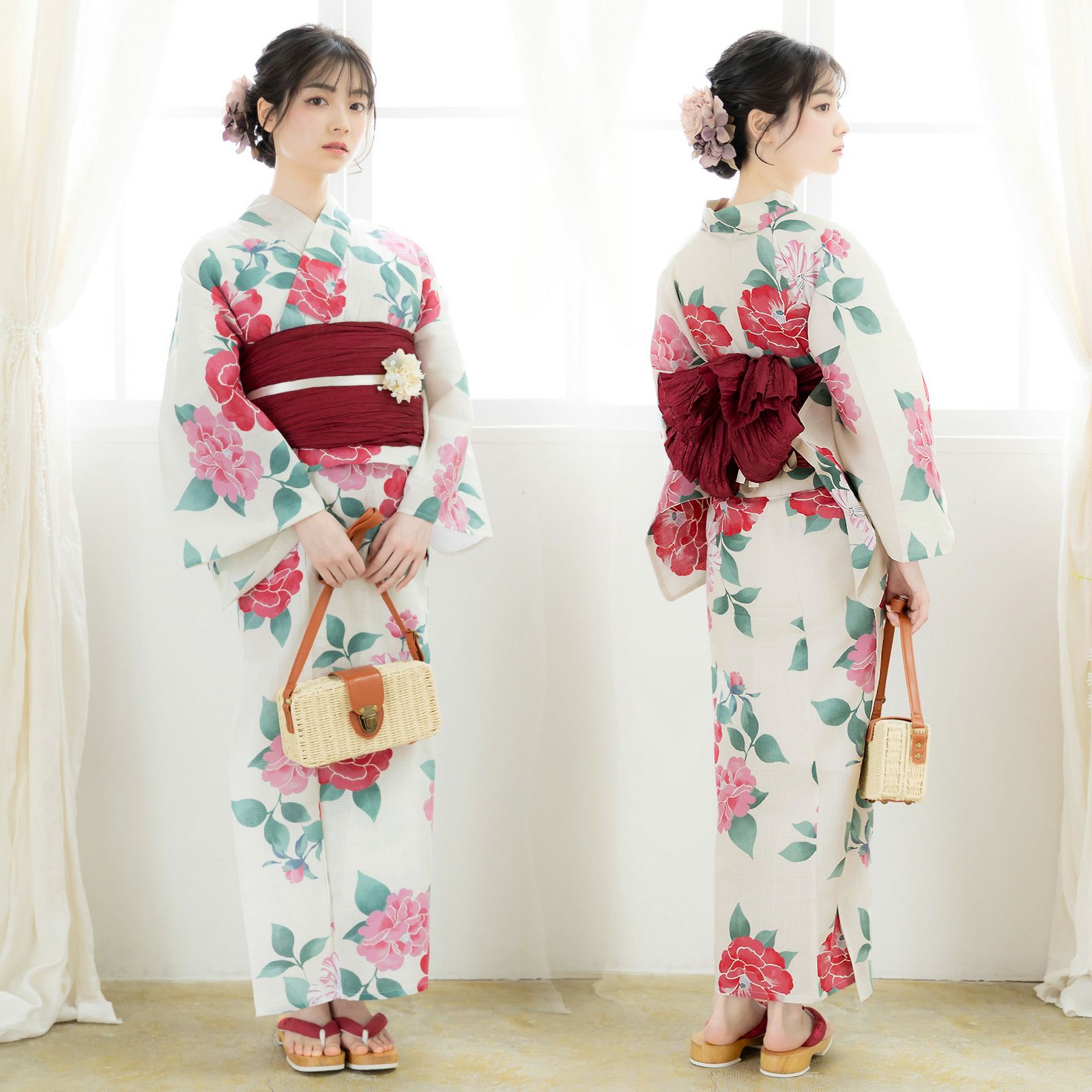 浴衣:アイボリーの地にピンク色と濃ピンク色、赤みのピンク色、白にピンク色の絞りの入った椿の花。青磁色のと緑の葉。ところどころかすれたような色合いと、輪郭線のない表現がレトロでかわいらしい雰囲気です。