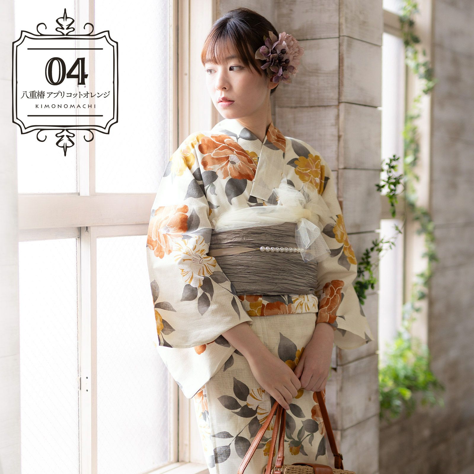 浴衣:アイボリーの地に杏色と橙色、代赭色、白に杏色の絞りの入った椿の花。鈍いグレーの葉。ところどころかすれたような色合いと、輪郭線のない表現がレトロで懐かしい雰囲気です。