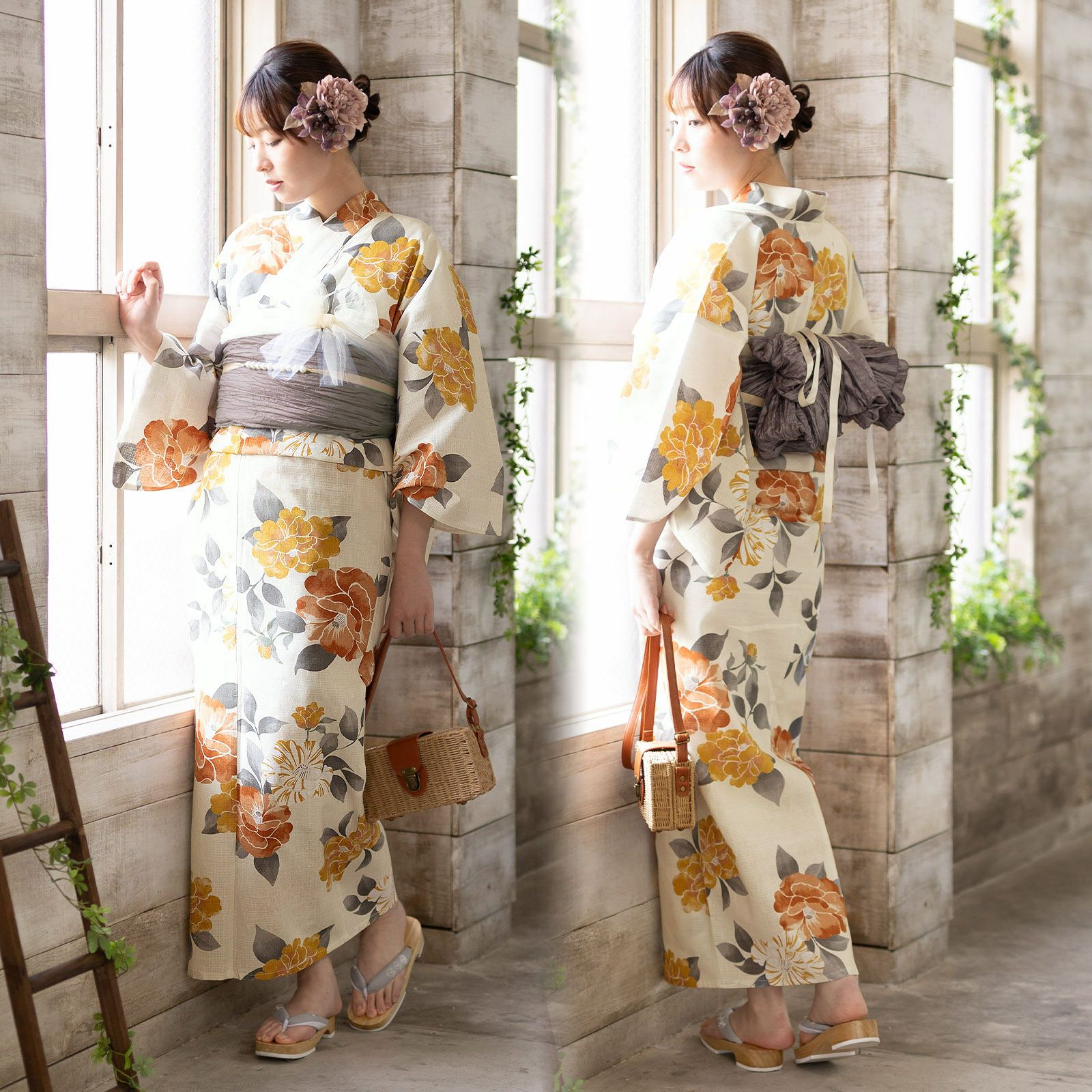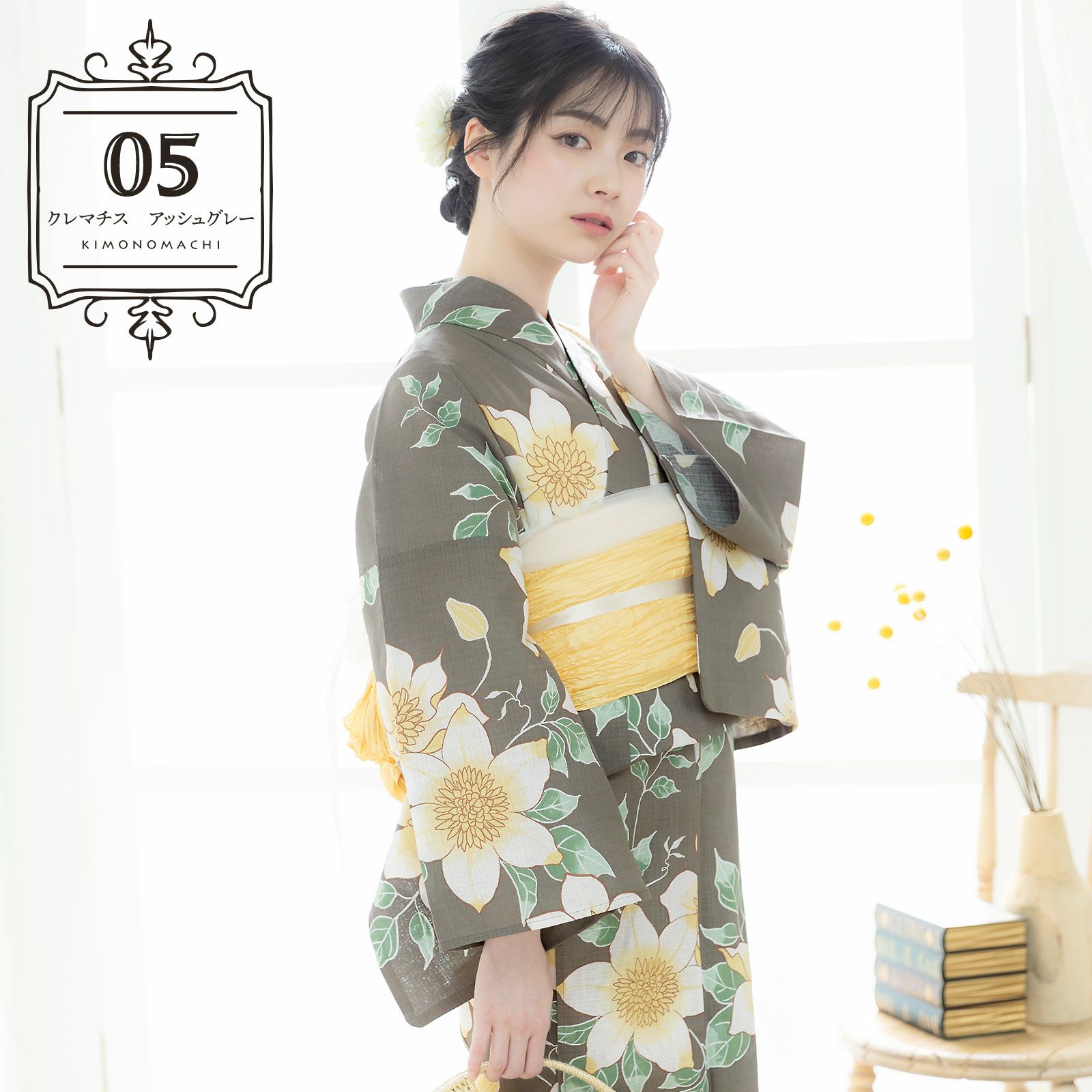 浴衣:わずかに緑みのグレーの地。茶色の輪郭線で表された生成り色に淡い黄色のクレマチスの花。白い輪郭線にくすんだ緑と薄緑の葉。レトロな柄行と現代的なカラーが魅力の浴衣です。