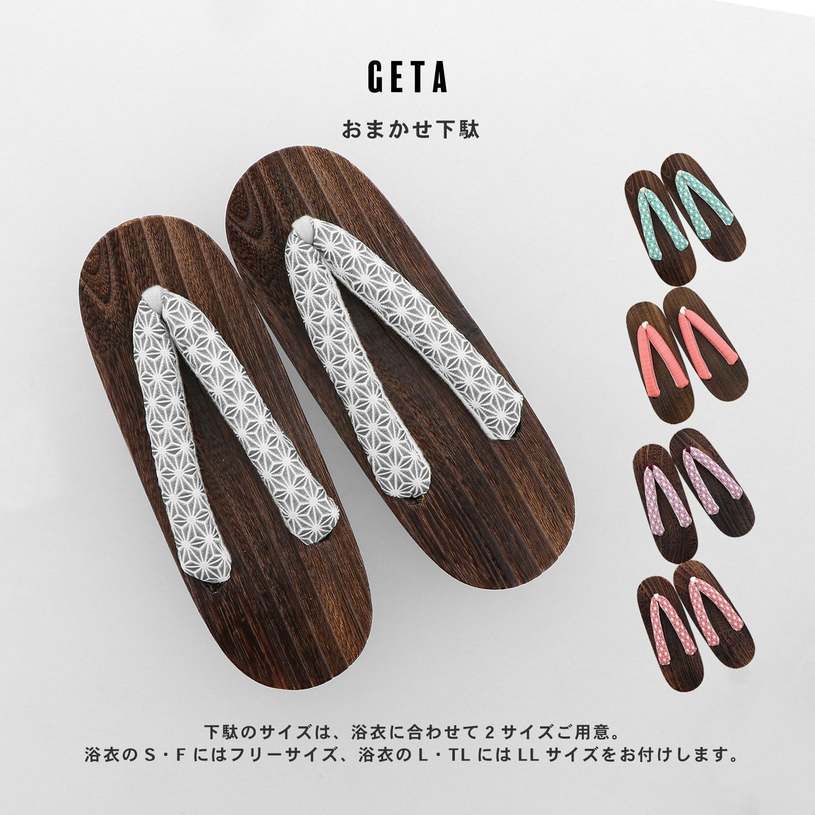下駄のサイズは、浴衣のS・Fにはフリーサイズの下駄、浴衣のTL・LLにはLLサイズの下駄をお付けします。