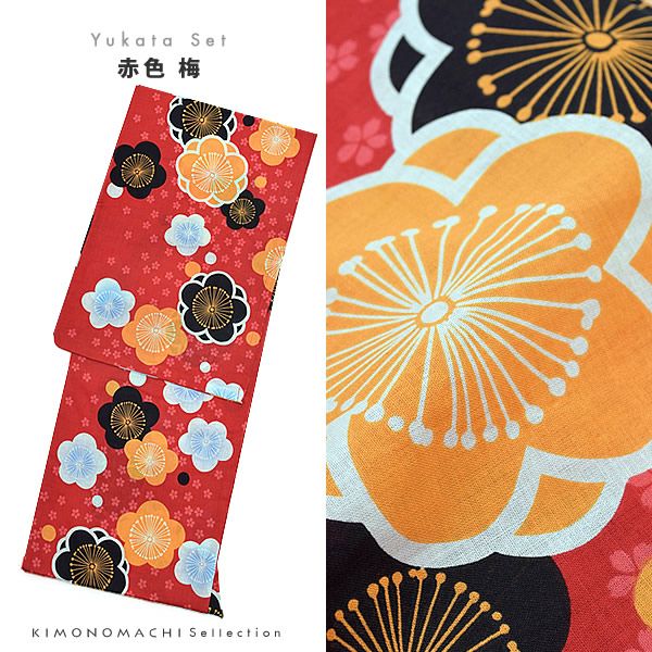 【カラー】浴衣は濃い赤色地に細かな小桜、まん丸な梅のお花、水玉模様。帯は黄緑色の、鮮やかなレタスグリーンの色合い。鼻緒は鮮やかな黄色地に梅のお花模様。台は焼桐の焦げ茶色。