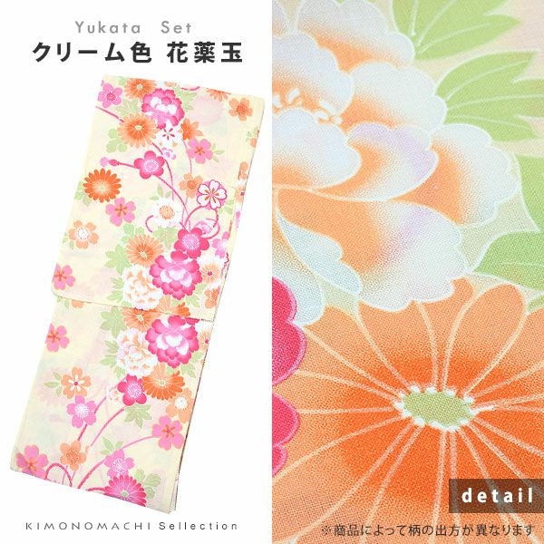 【カラー】浴衣は淡いクリーム色地に、牡丹、菊などの花くす玉模様。帯は黄緑色の、鮮やかなレタスグリーンの色合い。下駄は鼻緒は鮮やかな赤色地に桜模様。台は黒色の塗り。