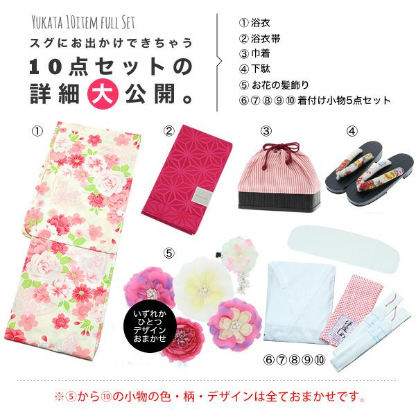 画像の浴衣、帯、下駄、巾着、浴衣スリップ、帯板、伊達締め、腰紐(2本)、浴衣飾り(お花飾り)の10点セットです。