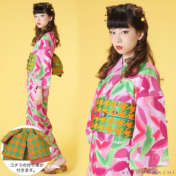 【カラー】浴衣は、薄いピンク地に、紫、マゼンタ、黄緑色の蝶々模様。帯は、濃い橙色地に明るい緑色の千鳥格子模様。