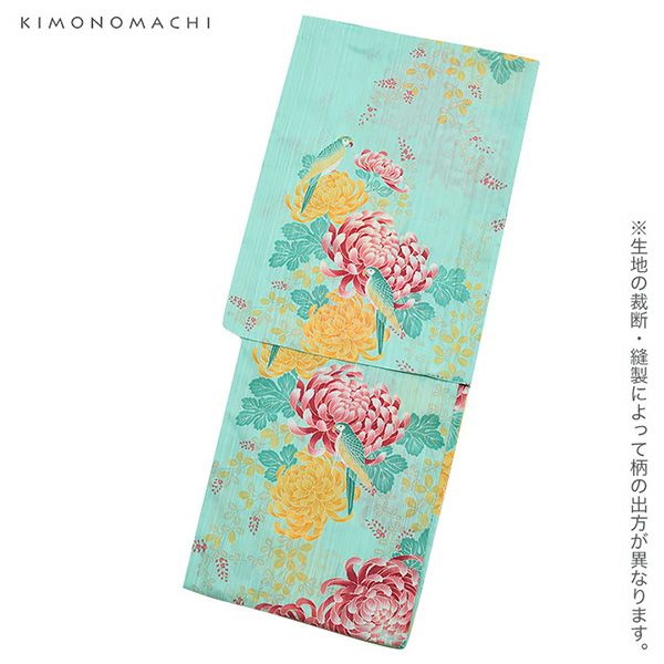 作り帯浴衣セット「水色 菊とオウム」S、F、TL、LL 綿 お仕立て上がり浴衣 浴衣2点セット 変わり織り